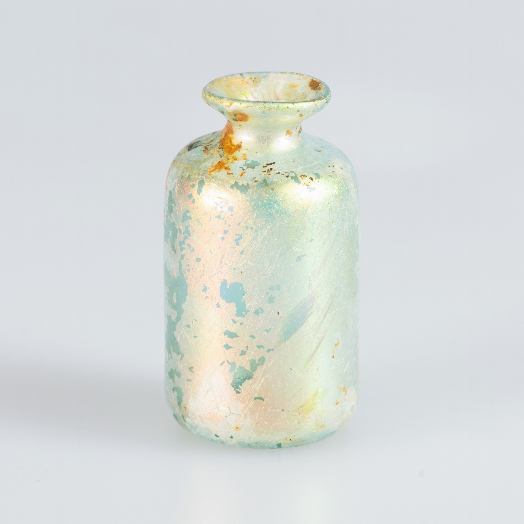 Medicijnfles; gl-fle-11; cilindrische medicijnfles met korte hals en uitgebogen rand, opgestoken bodem met pontilmerk; herkomst: Duitsland of Nederlanden