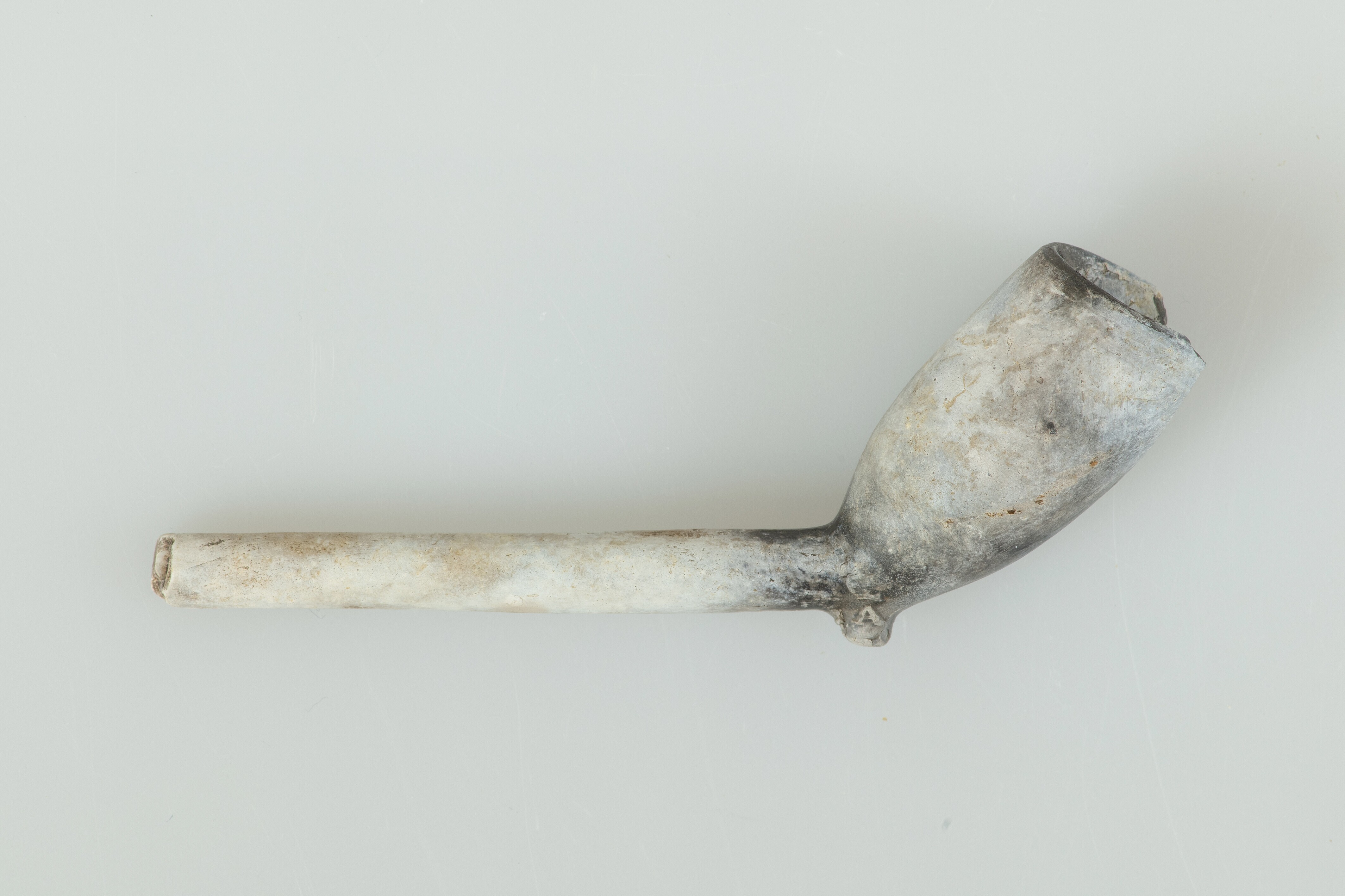 Pijp; trechtervormige ketel; bijmerk: GV gekroond / A gekroond; ongeglaasd; gebotterd; geen radering rondom ketelopening; ketel zwartgeblakerd; maker: Andries Cornelisz Groenevelt, Gouda