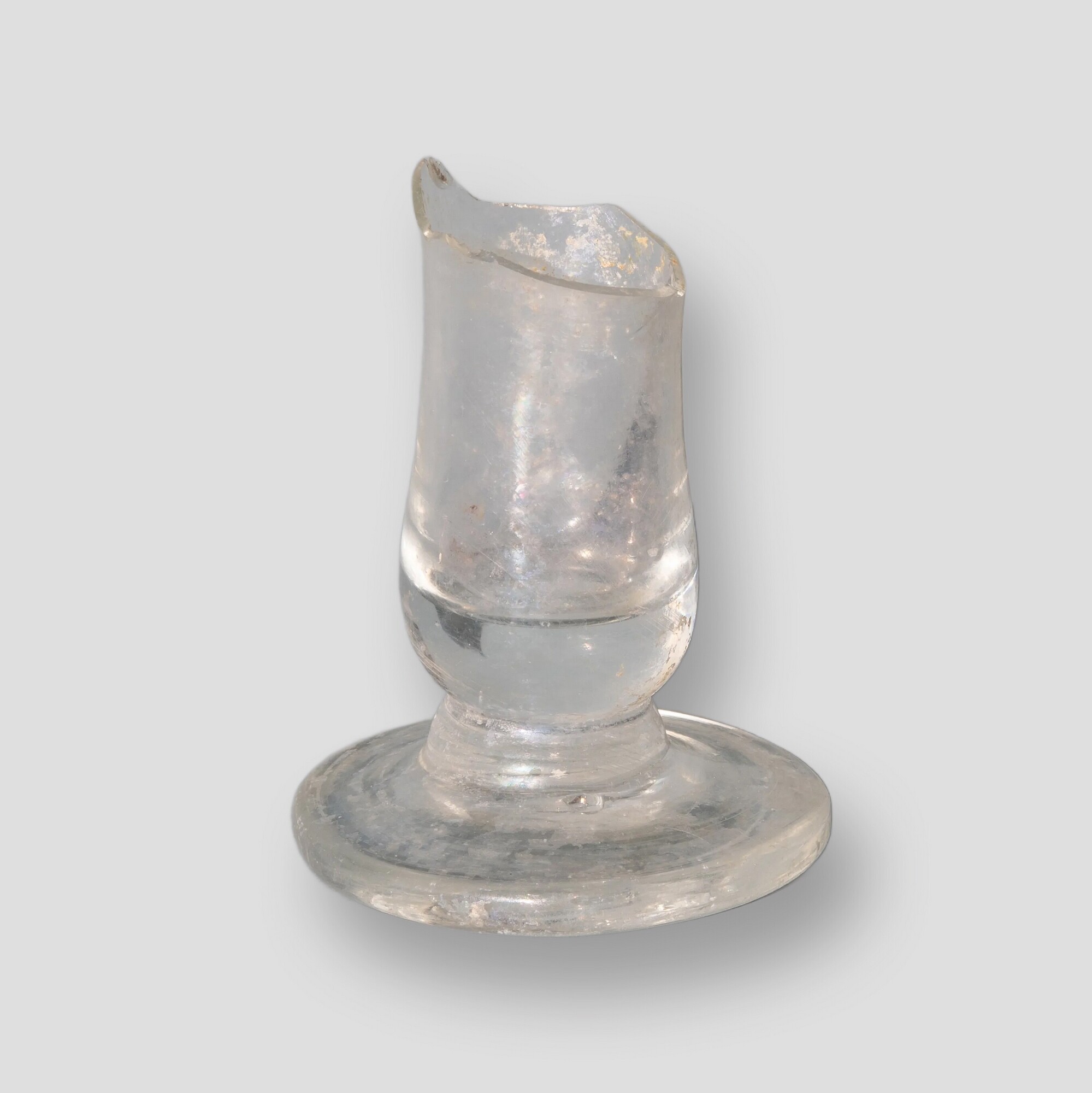 Kelkglas / borrelglas / 'kanonnetje' (fragment); gl-kel-21; trechtervormig kelkglas, dikwandige schijfvormige voet met pontilmerk; kleurloos sodaglas; herkomst: Duitsland