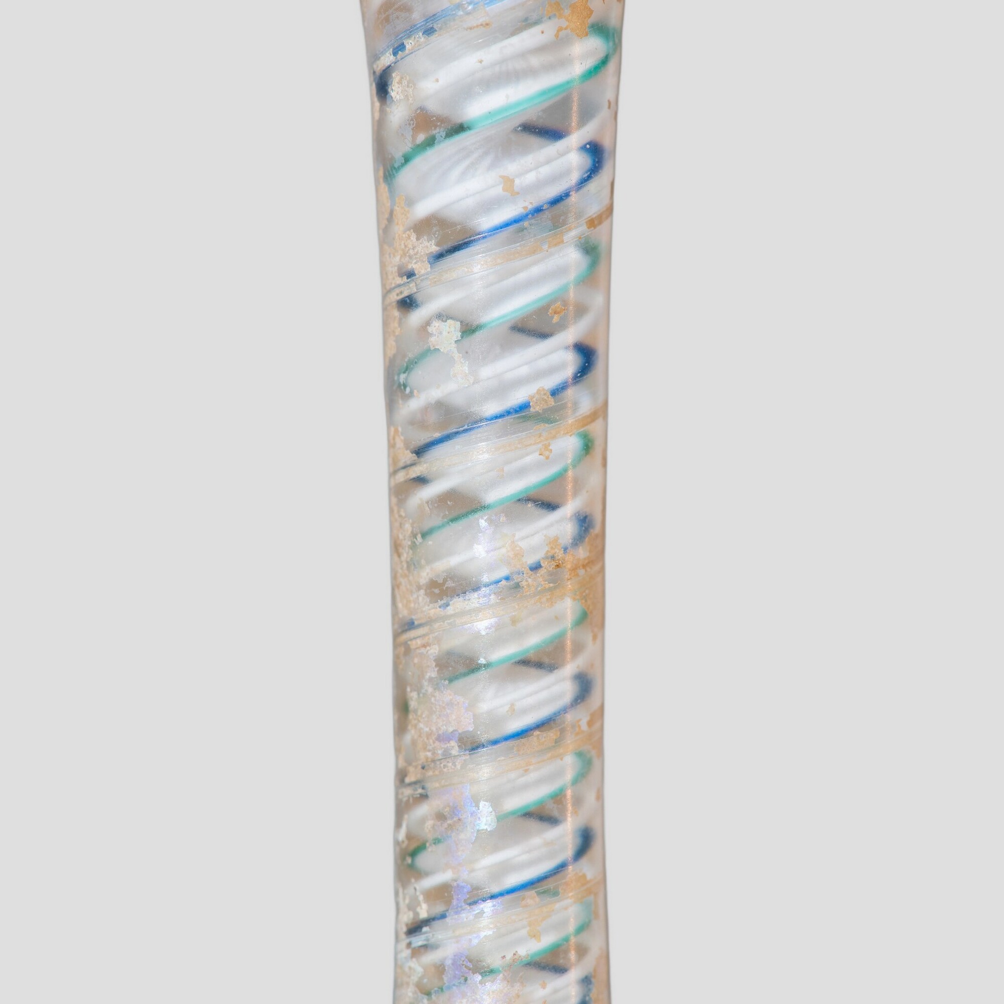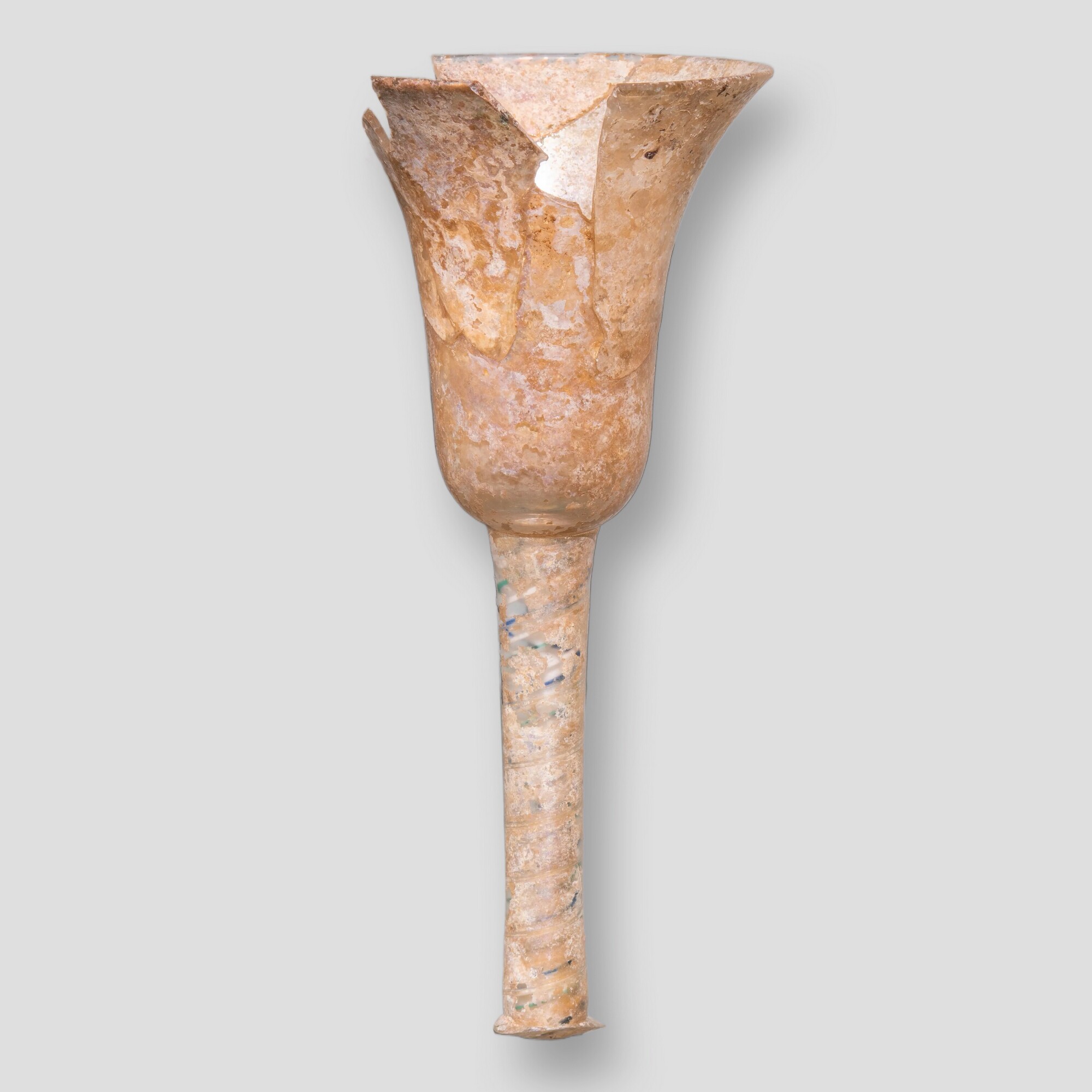 Kelkglas / slingerglas (fragment); gl-kel-1; klokvormig kelkglas met rechte stam; kleurloos loodglas; opaak witte, groene en blauwe spiralen in stam; herkomst: vermoedelijk Nederlanden