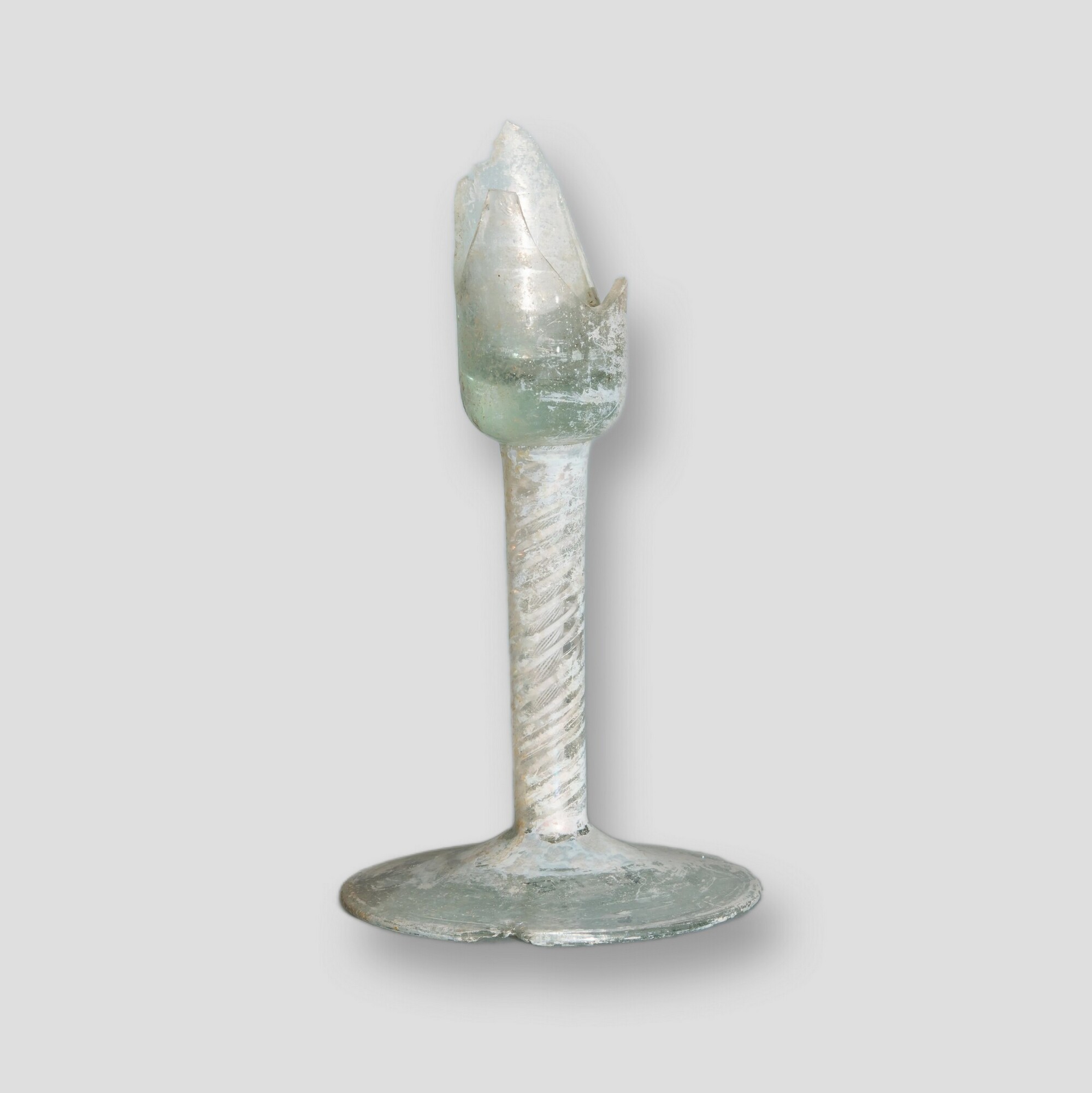 Kelkglas / slingerglas (fragment); gl-kel-1; klokvormig kelkglas met rechte stam, brede voet met pontilmerk; kleurloos sodaglas; opaak witte spiralen in stam; herkomst: vermoedelijk Nederlanden