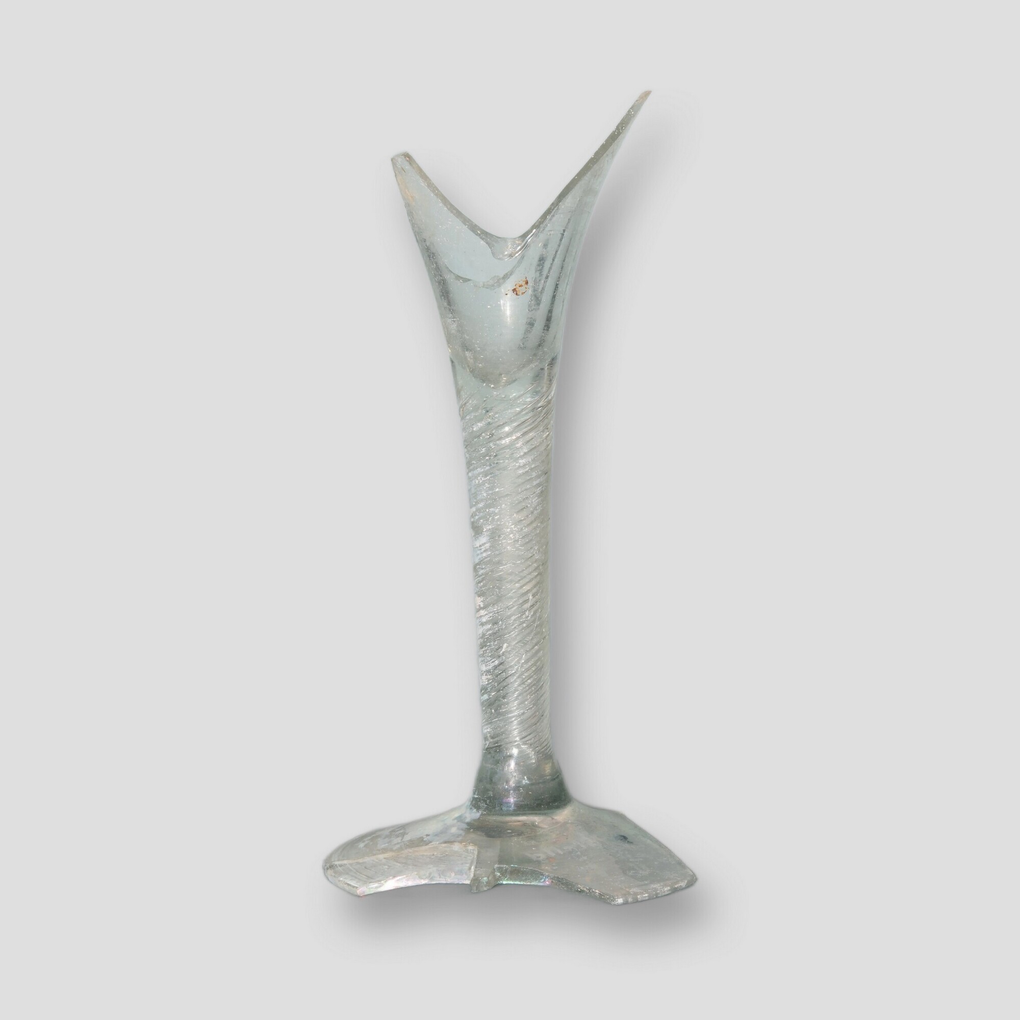 Kelkglas / slingerglas (fragment); gl-kel-2; trechtervormig kelkglas vloeiend overgaand in rechte stam, brede voet met pontilmerk; kleurloos sodaglas; luchtspiralen in stam; herkomst: vermoedelijk Nederlanden