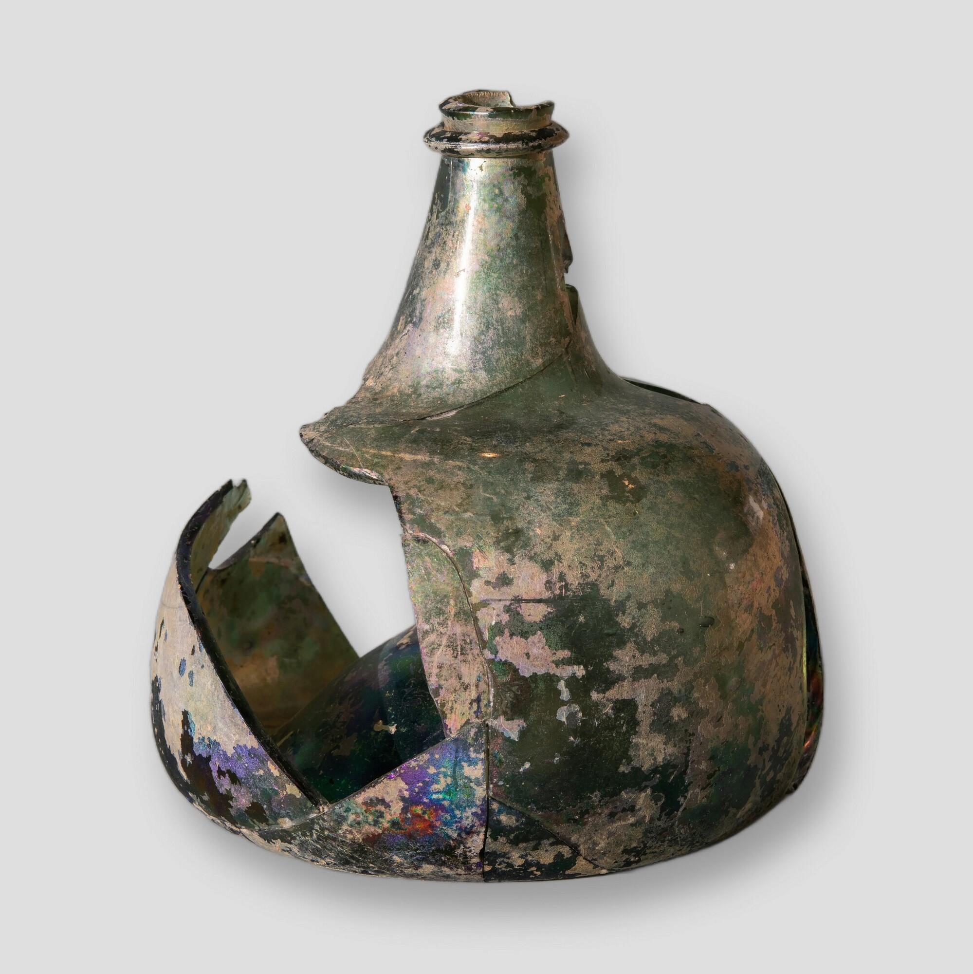 Wijnfles:hoge hals, opgebolde bodem