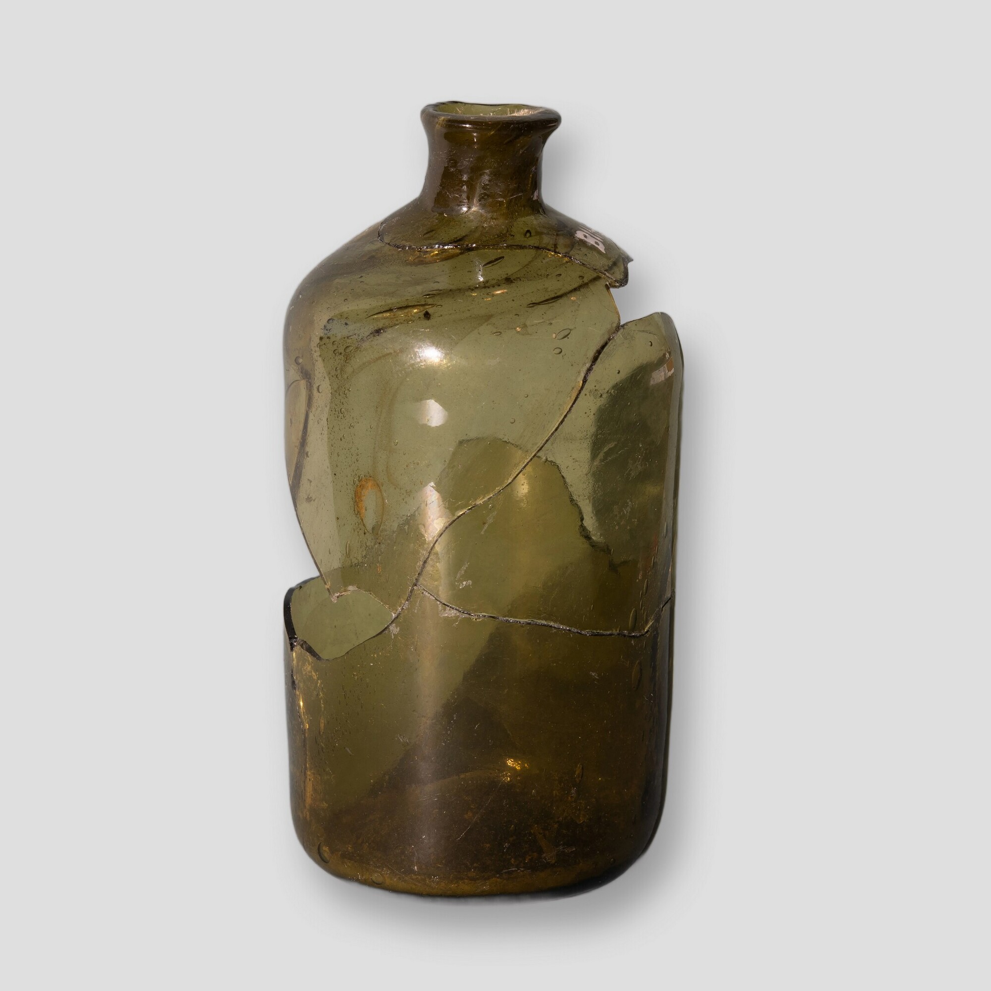 Medicijnfles / apothekersfles; gl-fle-11; cilindrische medicijnfles met korte hals met uitstaande rand, opgestoken bodem met pontilmerk; groen glas; herkomst: Nederlanden