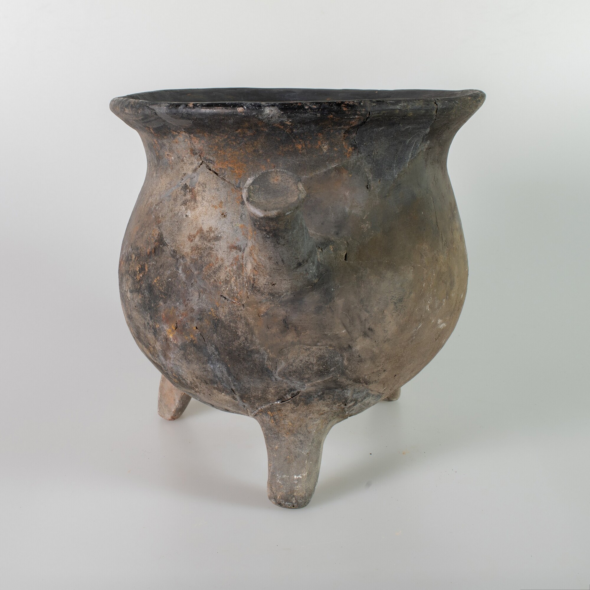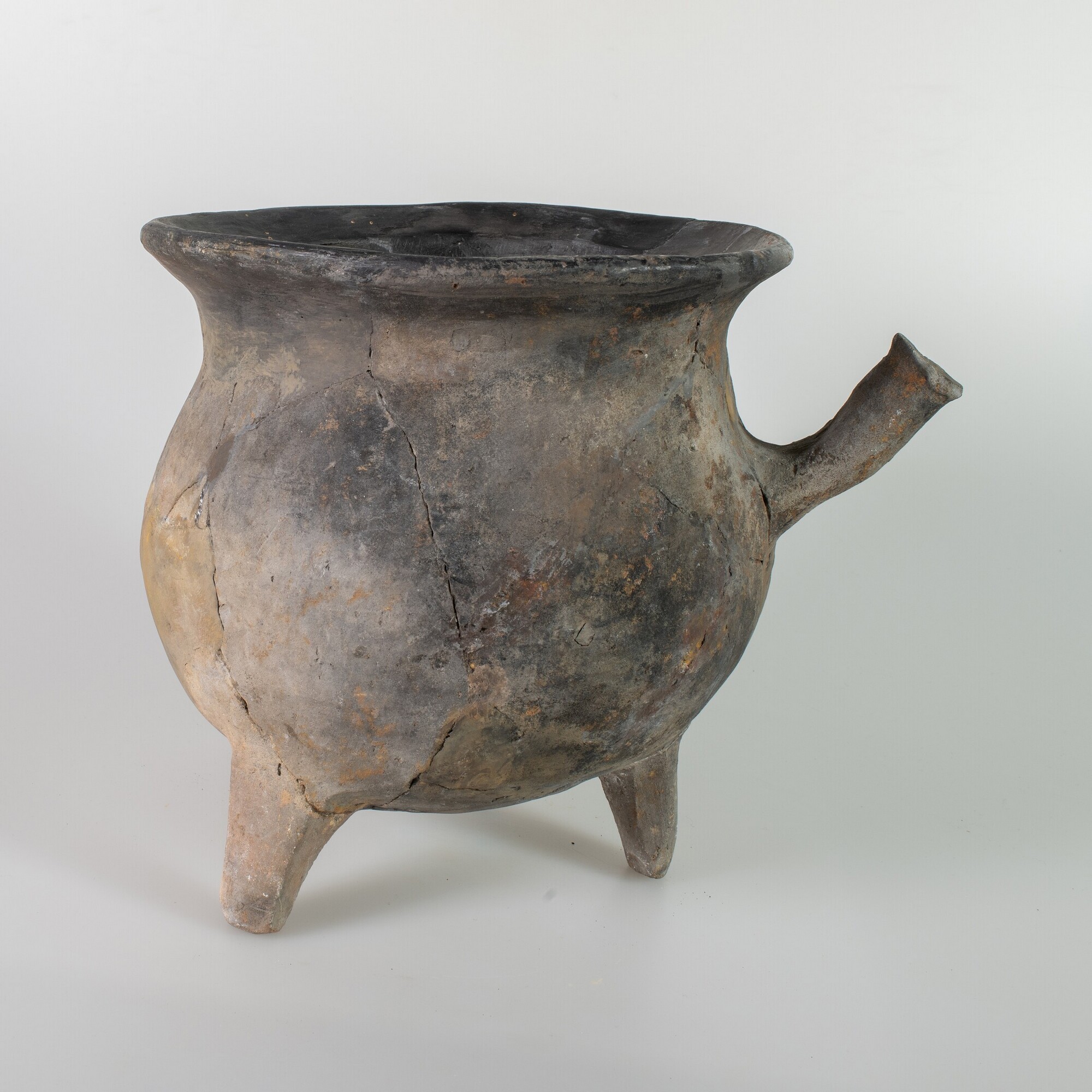 Grape; jy-gra-1; bolle grape met geknikte opstaande rand, drie poten, ronde opstaande steel; jydepot-aardewerk; ongeglazuurd, inwendig gepolijst; uitwendig beroet; herkomst: Jutland, Denemarken