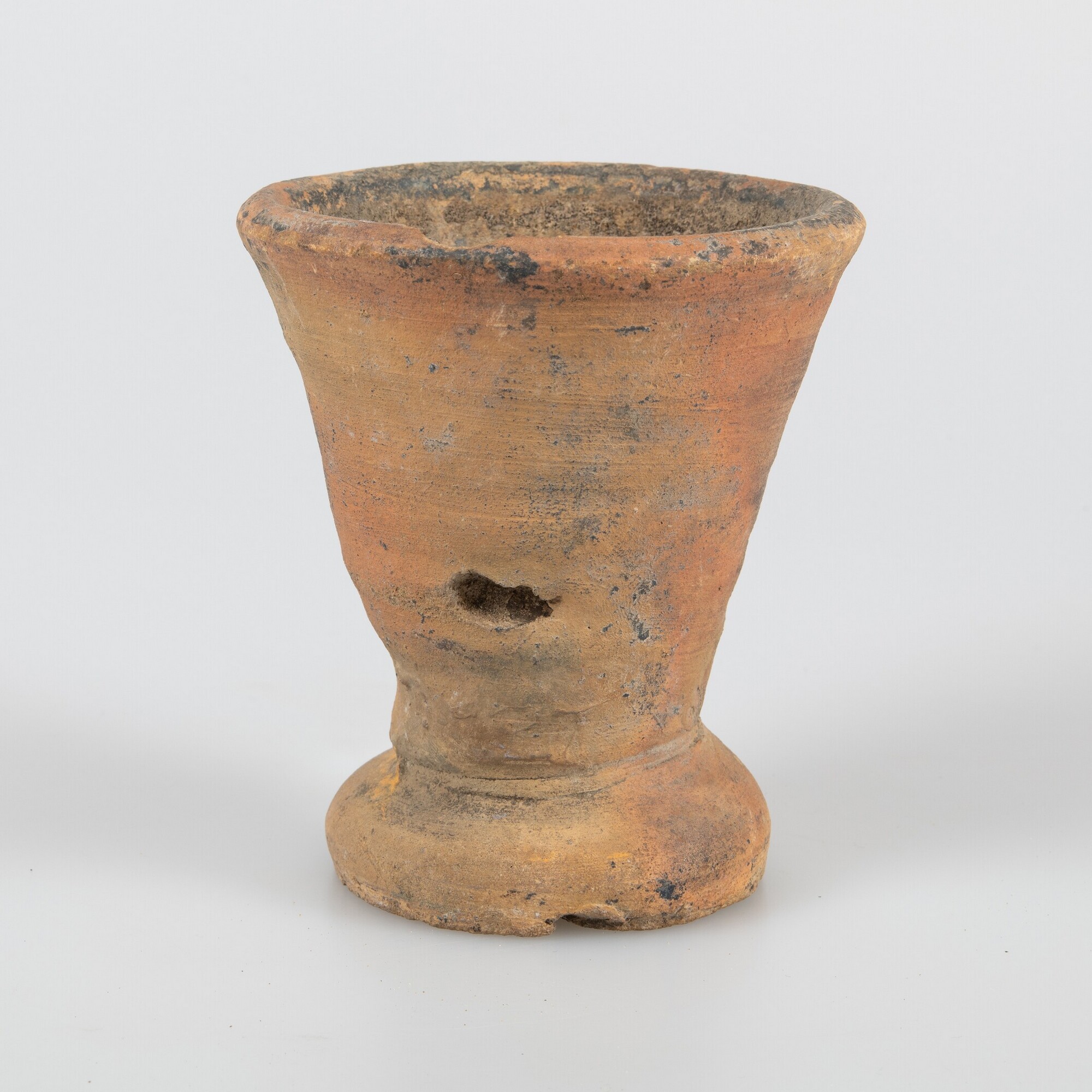 Loodwitpot; r-lwp-1; conische loodwitpot op zware standvoet; roodbakkend aardewerk; inwendig zwarte resten loodwit; herkomst: West-Nederland