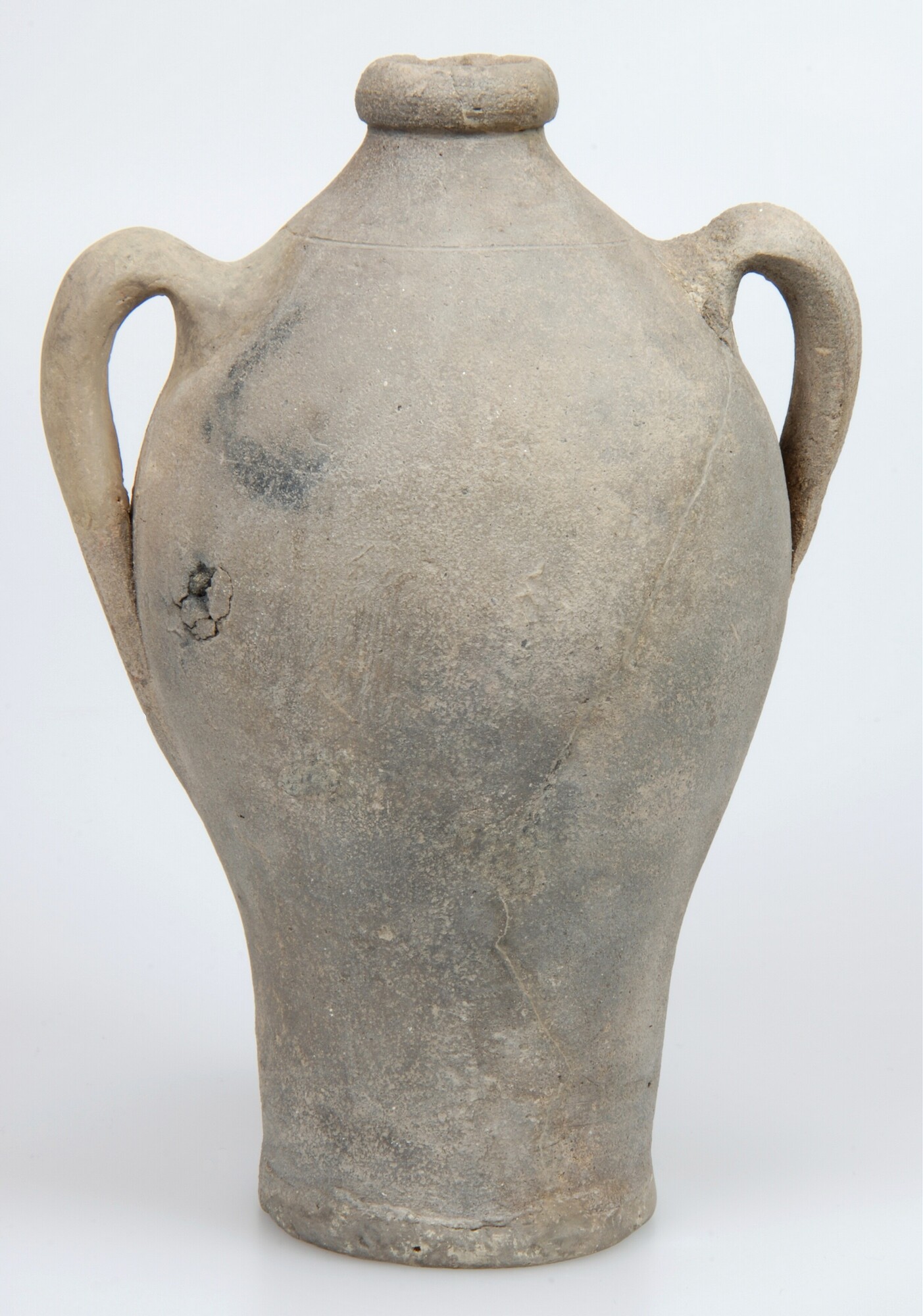 Kruik; ib-kru-1; afgerond dubbelconische kruik zonder hals en met verdikte rand, standvlak, twee verticale lintoren; Iberisch roodbakkend aardewerk (Merida ware); herkomst: Portugal
