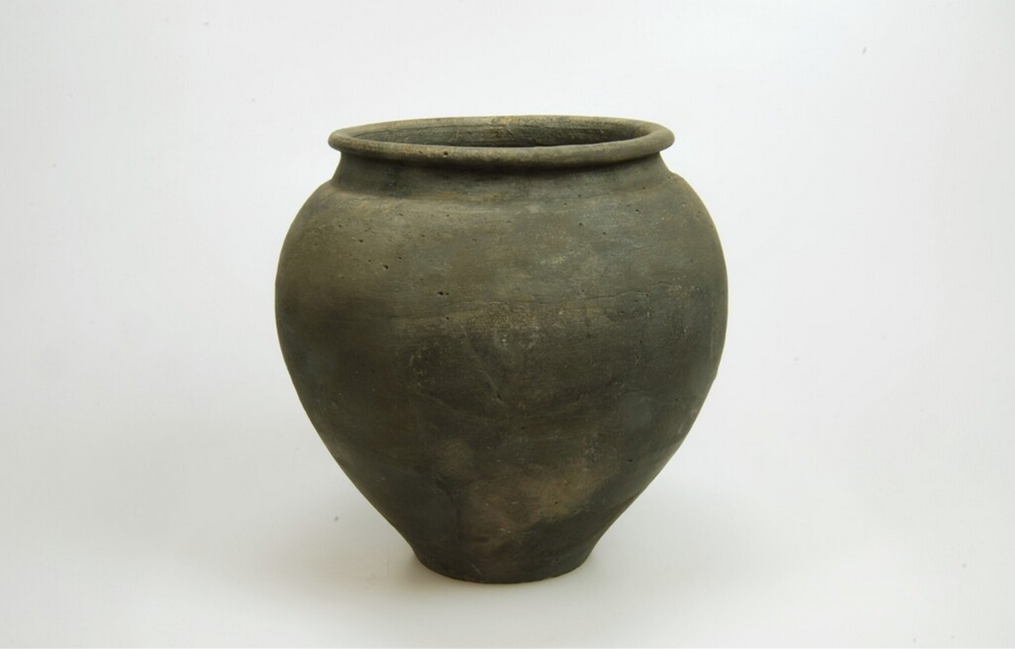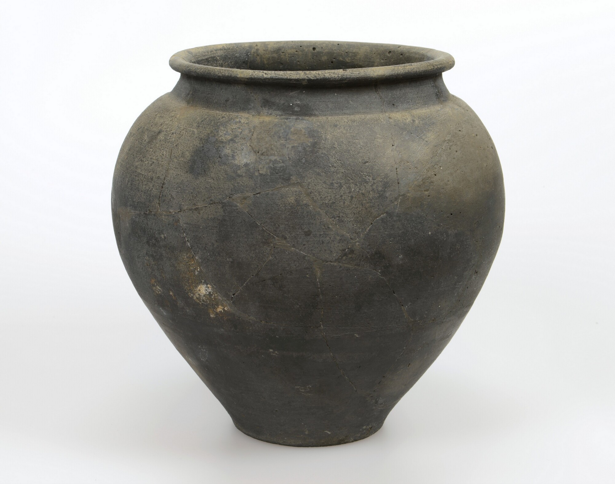 Kookpot; type Stuart 201A; ruwwandig aardewerk; bolvormige pot met omgeslagen rand en horizontale groef op de schouder, onder de hals; standvlak; herkomst: Rijnland/Noord-Frankrijk?; vondstgegevens: 1486 en 3337