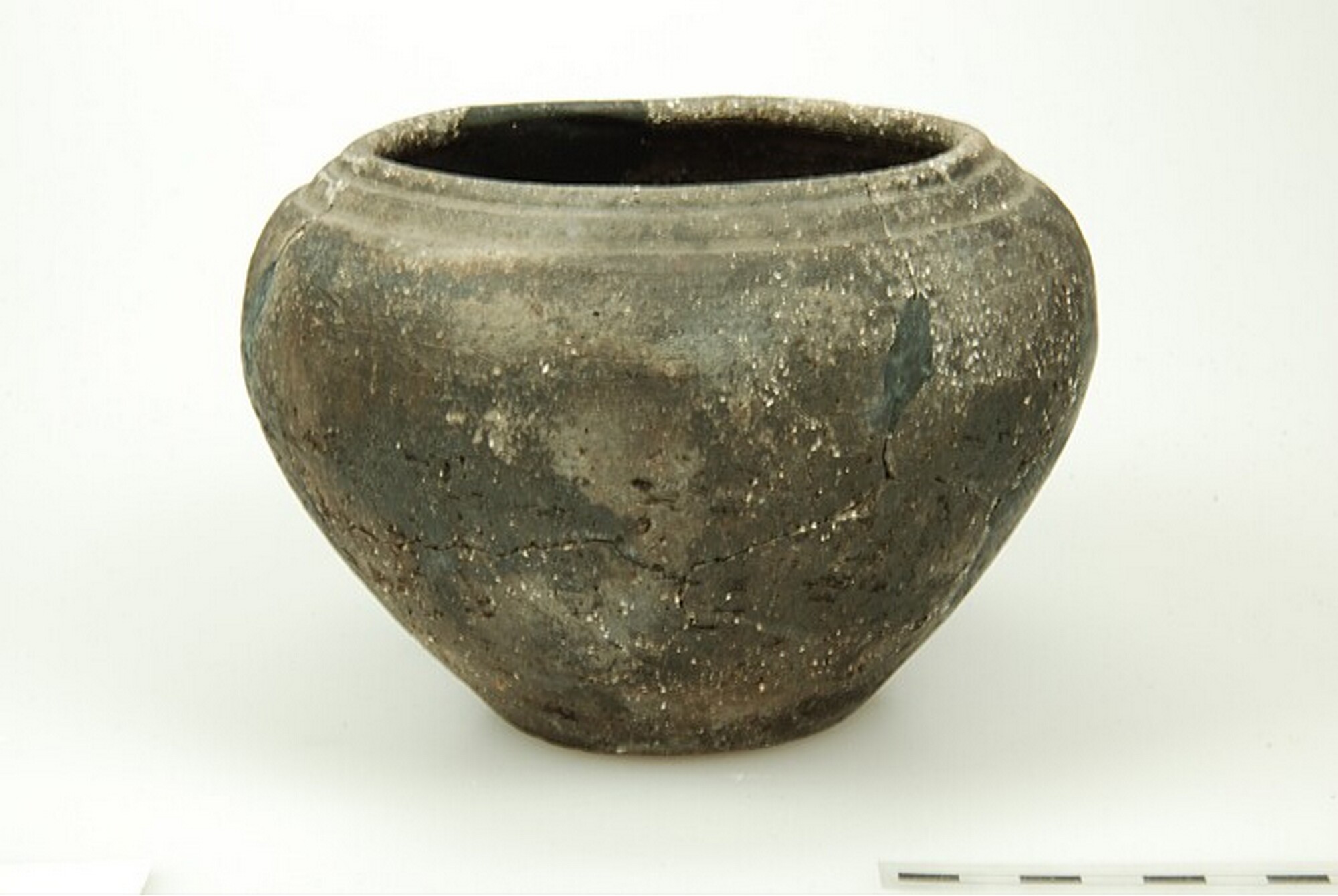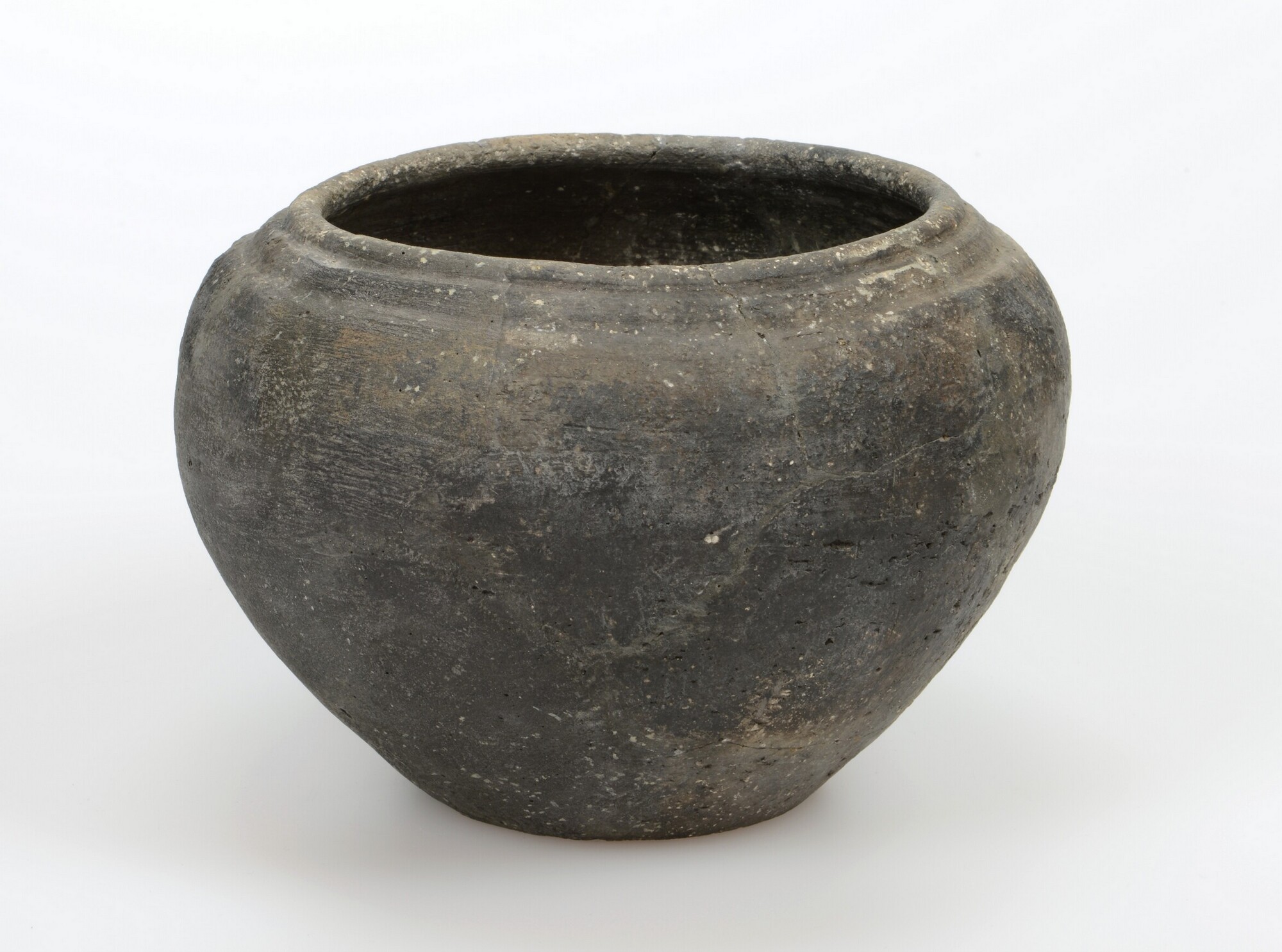 Kurkurn; bolvormig met een naar binnen gebogen rand en voorzien van twee brede, horizontale groeven; kwartsmagering; herkomst: Eifel