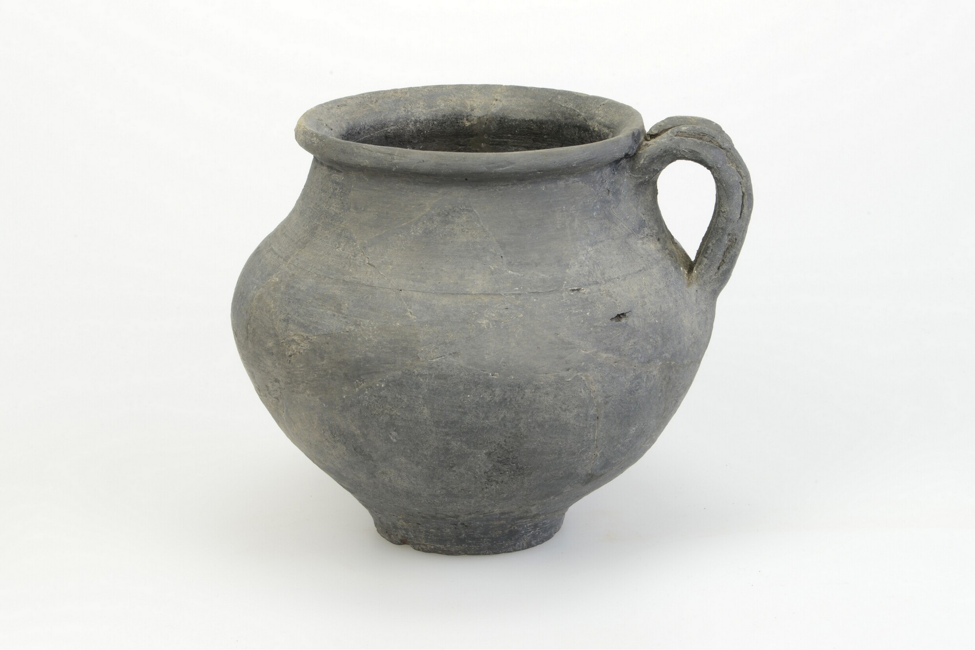 Kookpot; type Stuart 213A; ruwwandig aardewerk; gedraaid; oor; grijs-zwart; groeflijnversiering; herkomst: Rijnland; scherfnummer 2307