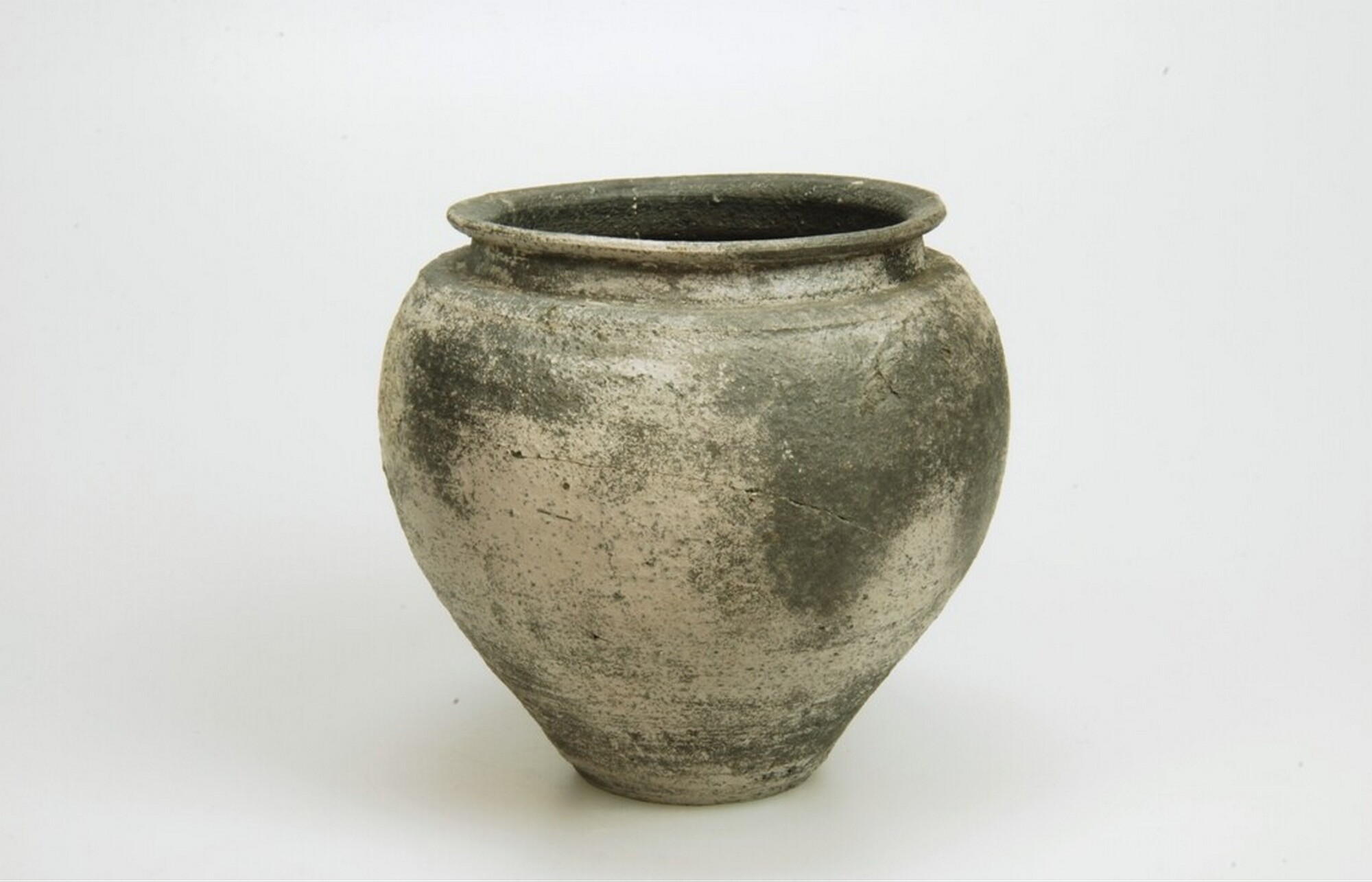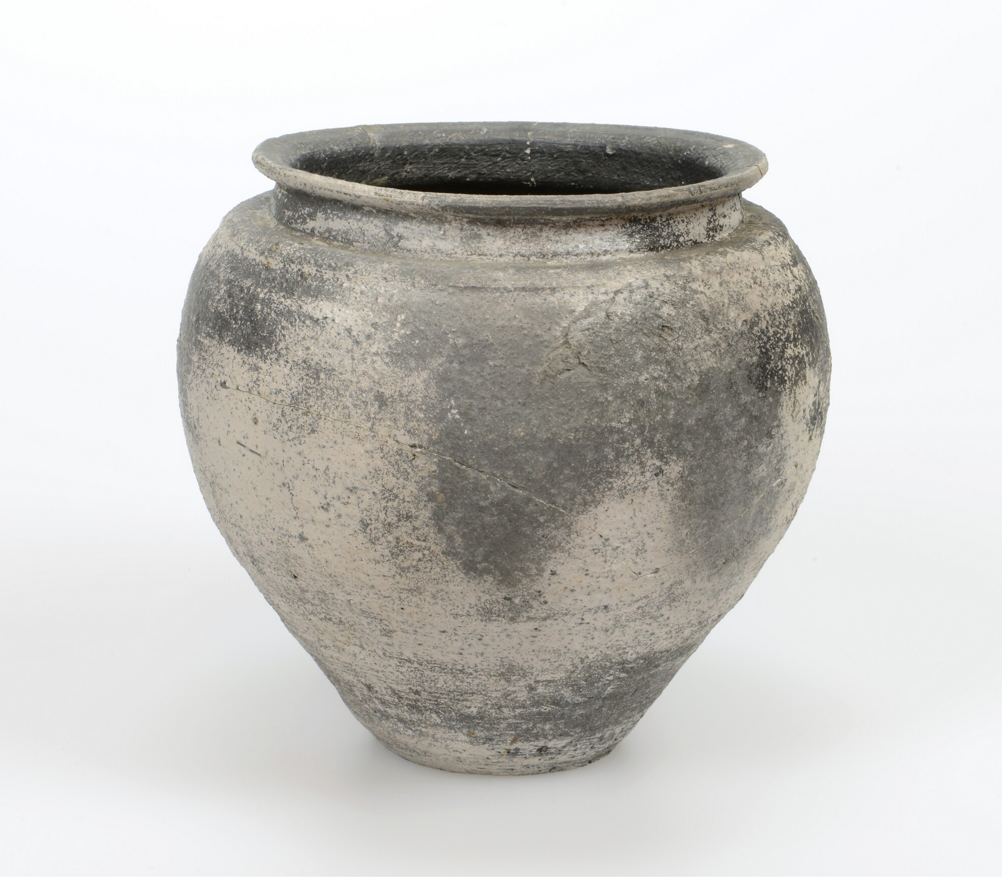 Kookpot; type Stuart 201v; ruwwandig aardewerk; bolvormige pot met lage, korte ronde rand, een zeer lage hals en een scherpe knik bij de overgang op de schouder/wand; standvlak