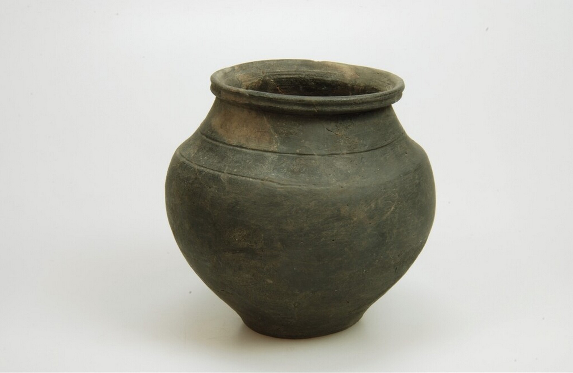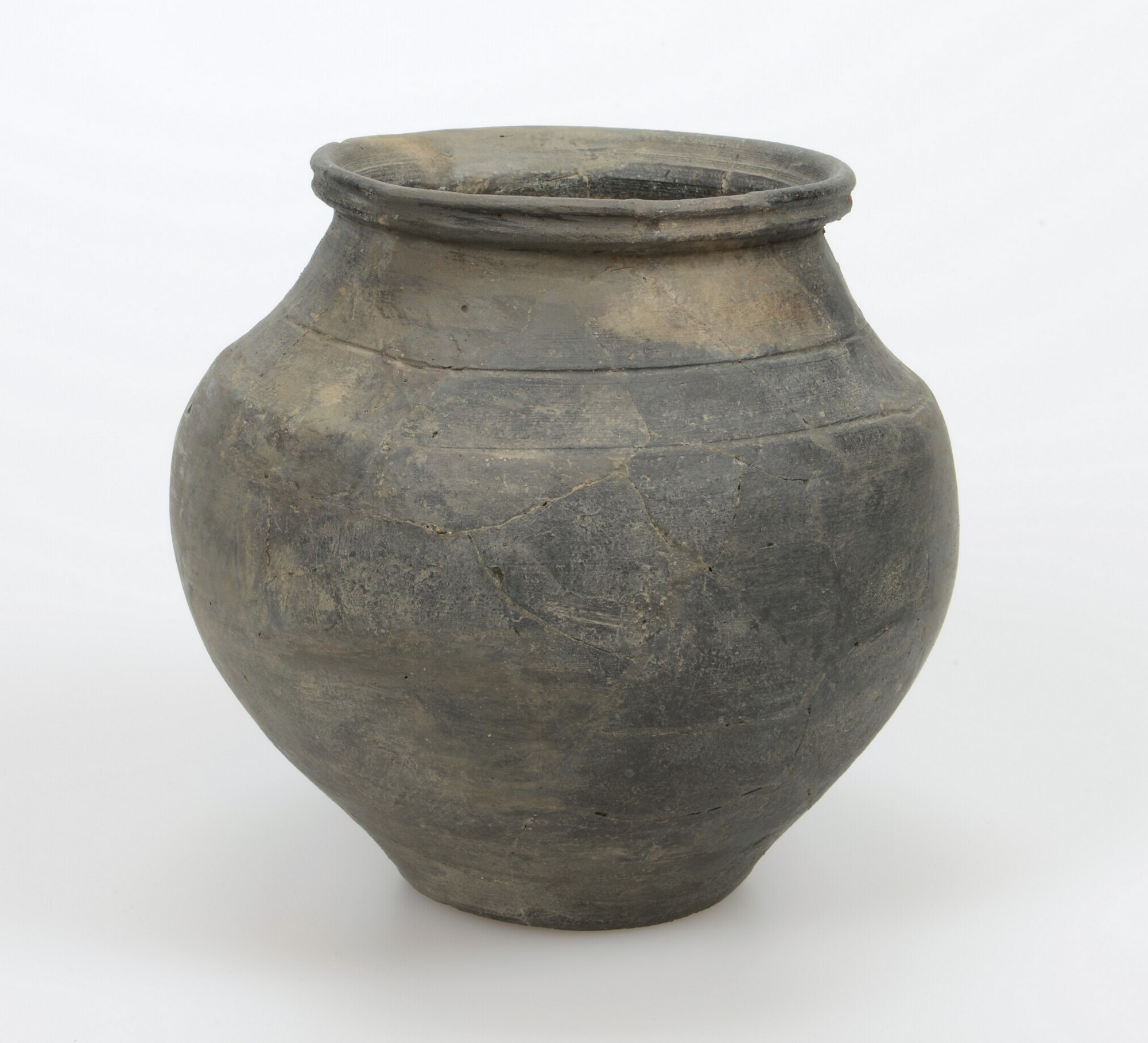 Kookpot; type Stuart 213a ; ruwwandig aardewerk; bolvormige pot met een relatief hoge hals, een geprofileerde rand met dekselgeul. De rand is afgerond hoekig en heeft een horizontale groef over de buitenzijde. Op de overgang van hals naar wand zijn twee horizontale groeven aangebracht; herkomst: Rijnland