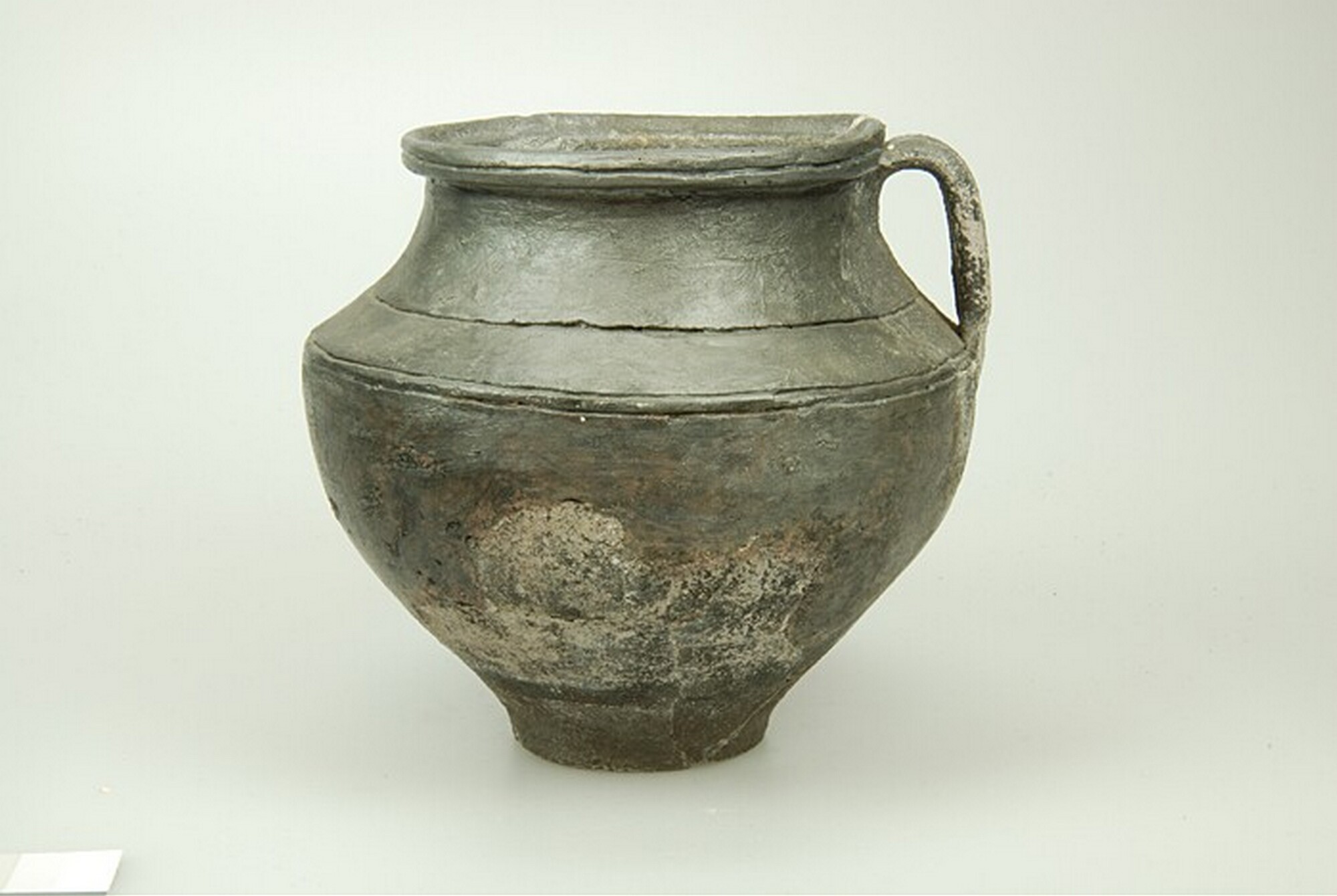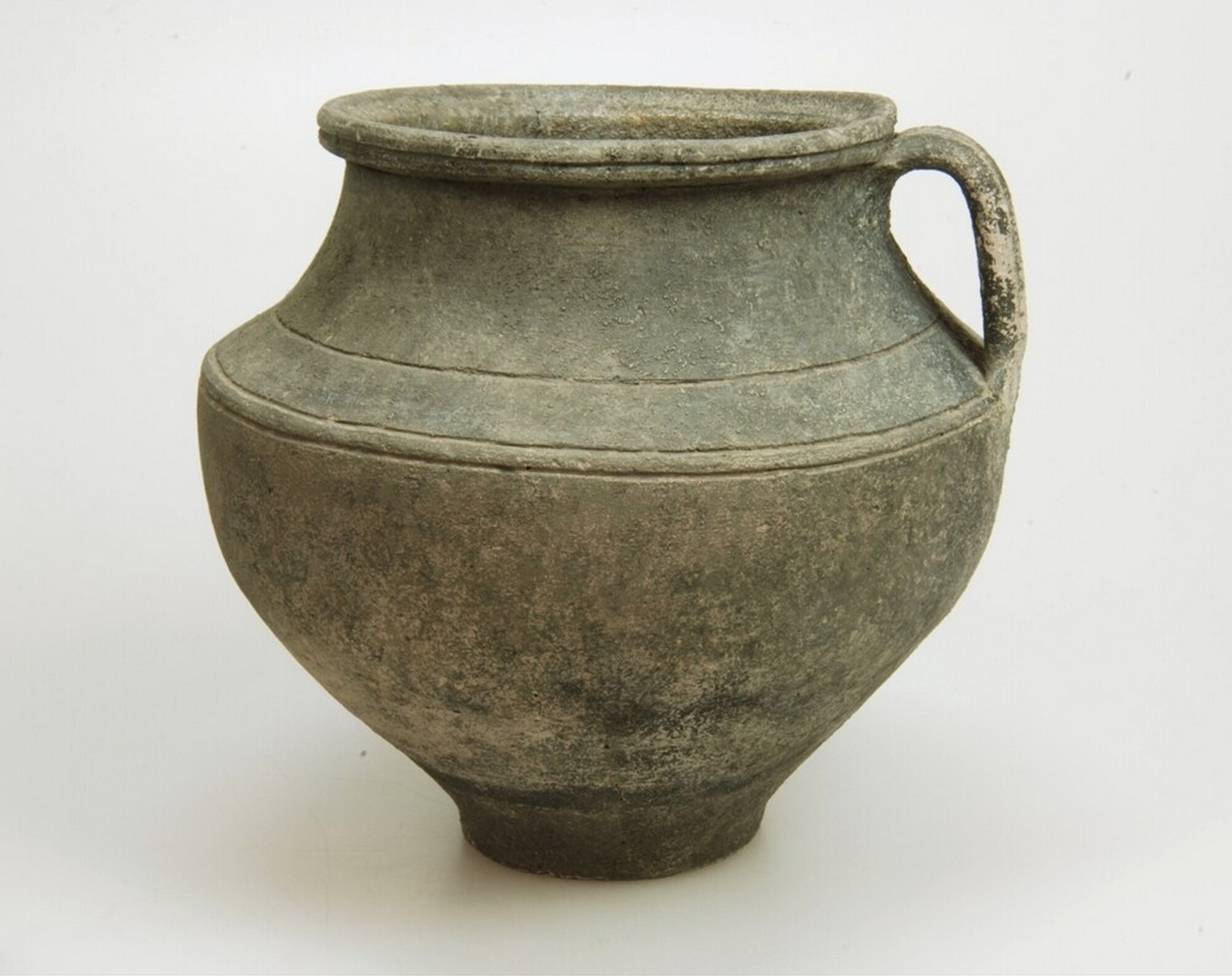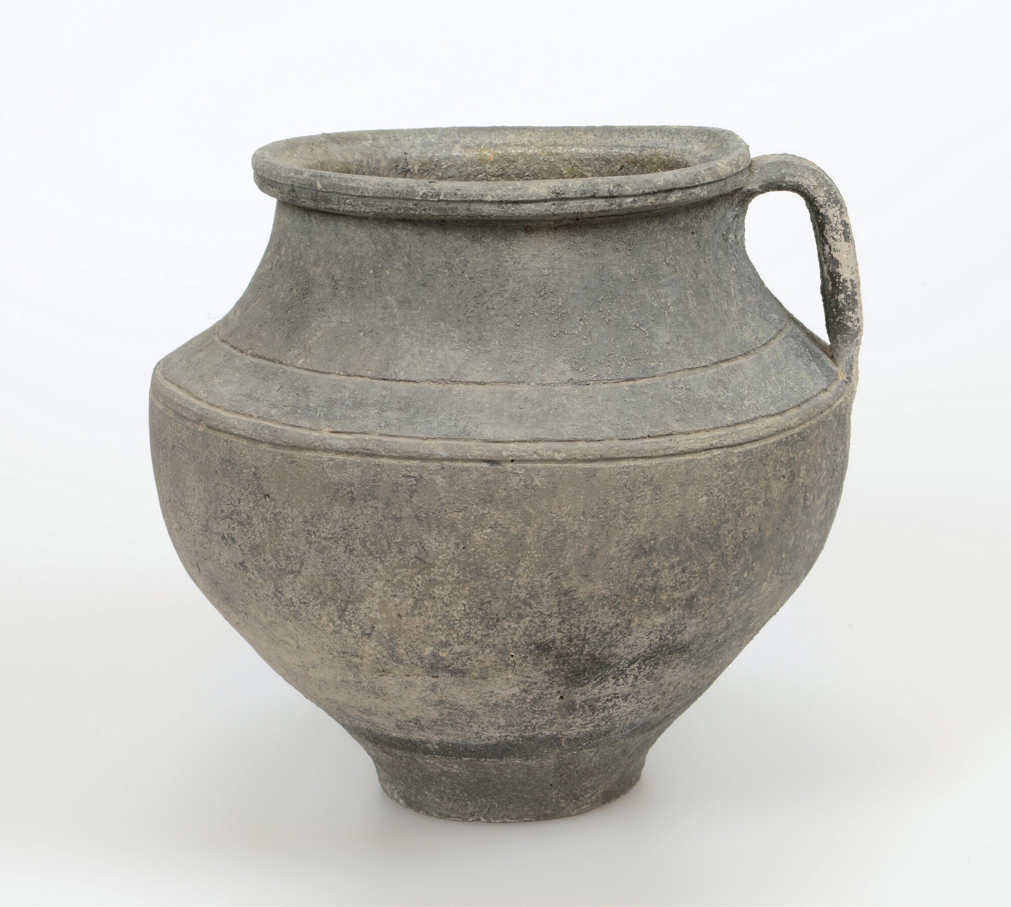 Kookpot; type Stuart 213a; ruwwandig aardewerk; bolvormige pot met een relatief hoge hals, een geprofileerde rand met dekselgeul. De rand is afgerond hoekig en heeft een horizontale groef over de buitenzijde. Op de overgang van hals naar wand zijn drie horizontale groeven aangebracht; verticaal lintoor; standvlak; herkomst: Rijnland; vondstgegevens: 1621