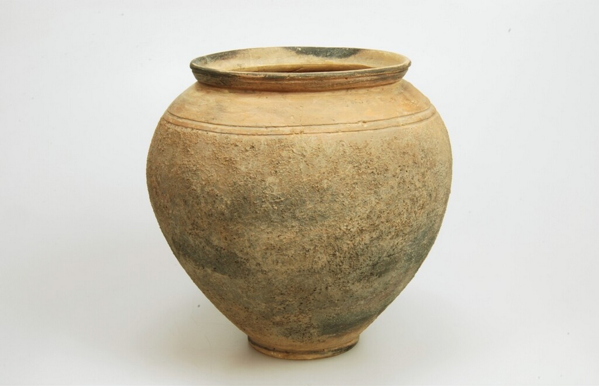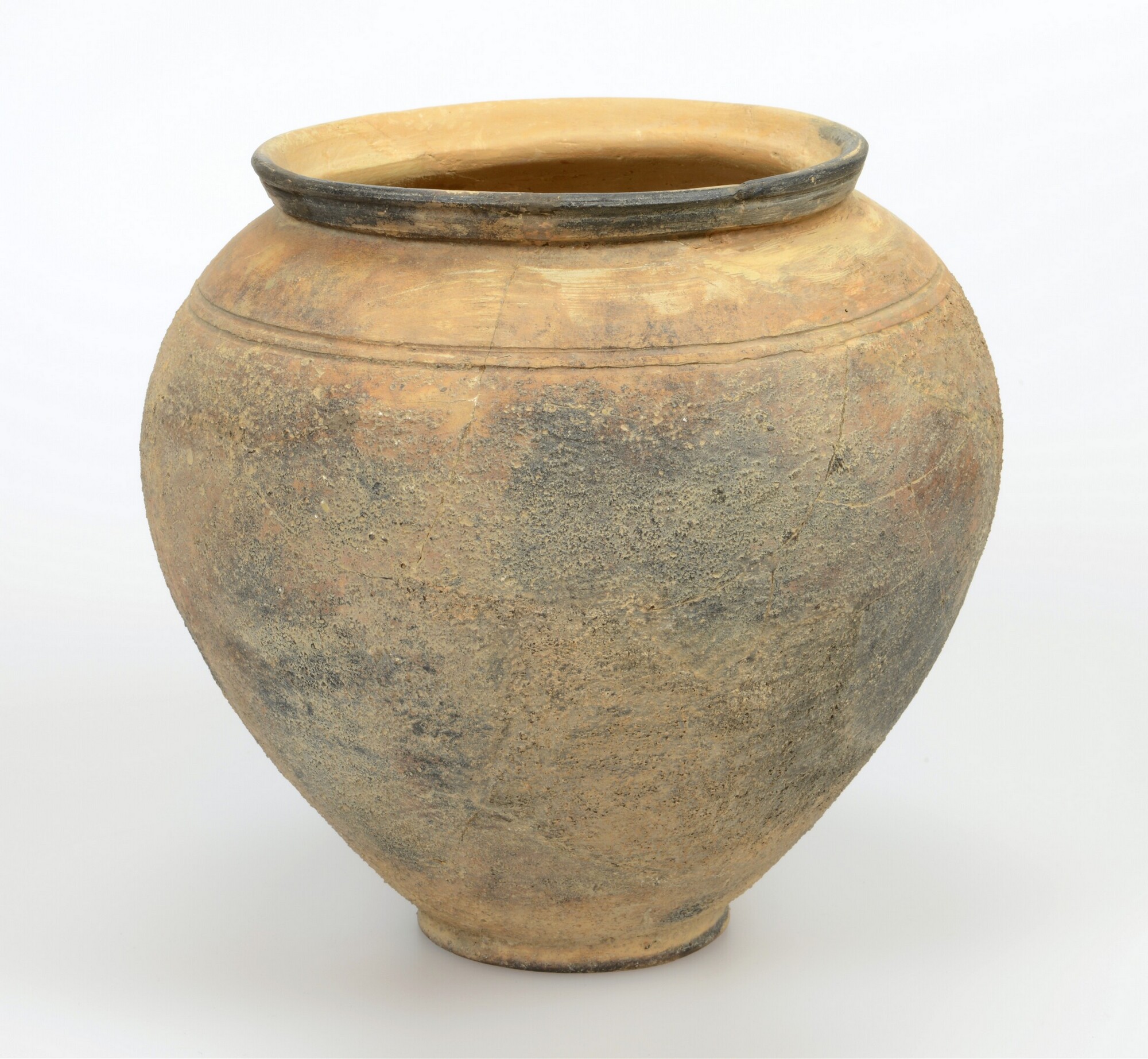 Beker; type Stuart 1B/Hofheim 26; bolle beker met schuine, iets holle rand en diepe groef onder de bodem, met dubbele groeflijnversiering op de schouder; geelbruin geverfd aardewerk; zandbestrooid; buitenzijde vrijwel volledig beroet; standvlak; herkomst: Rijnland; vondstgegevens: F1