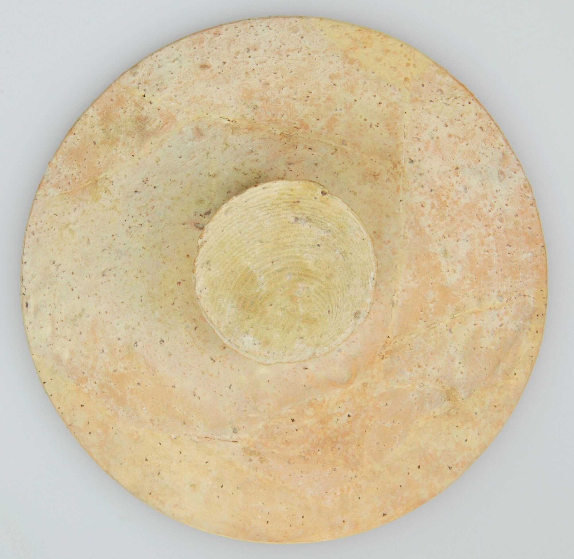 Deksel; ruwwandig aardewerk; ronde deksel met knop en verdikte rand die rechthoekig in doorsnede is; scherfnummer 1434