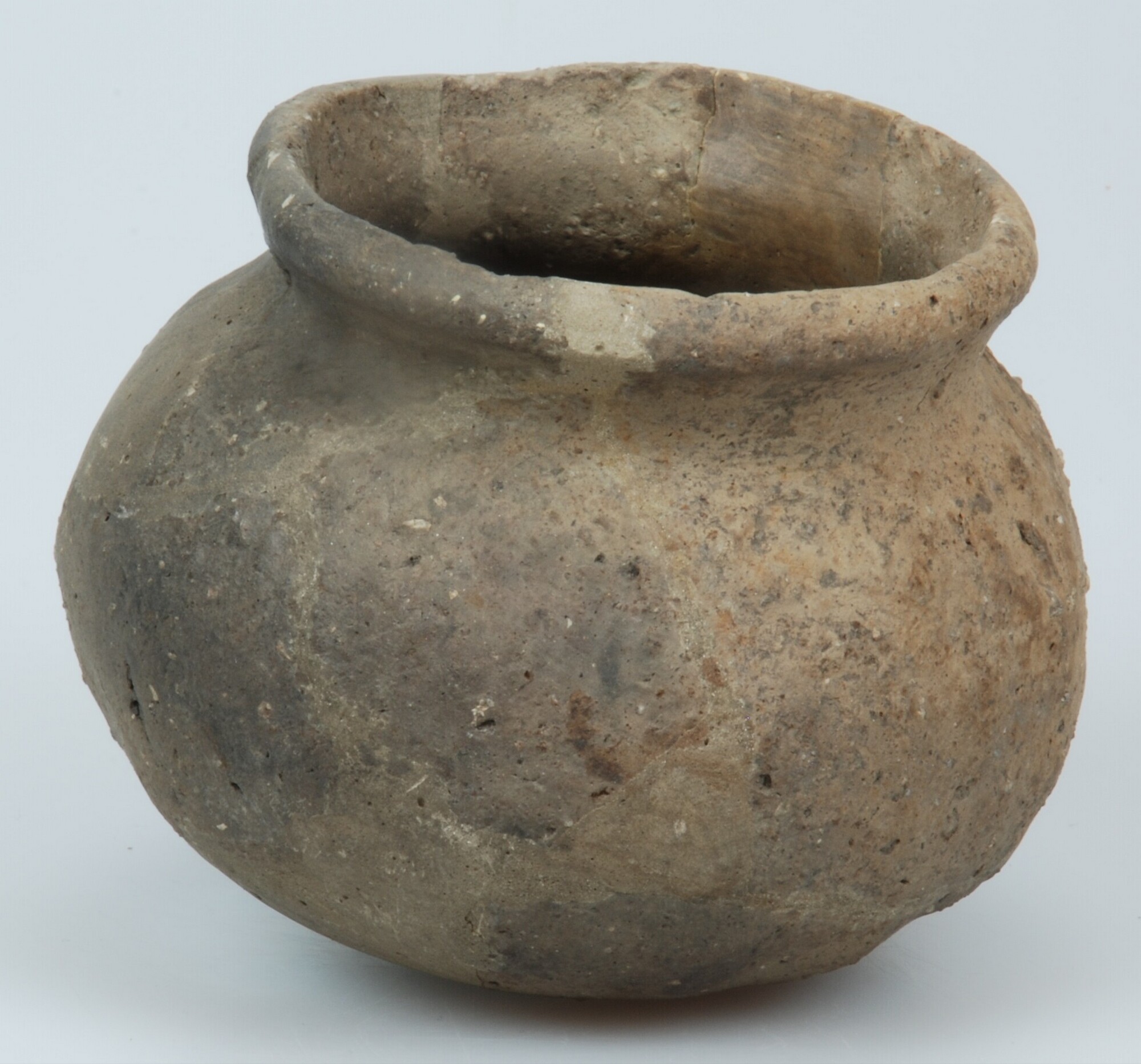 Kogelpot; bolle buik overlopend in een vierkante rand (Midwoud type 2); standvlak; steengruis-magering