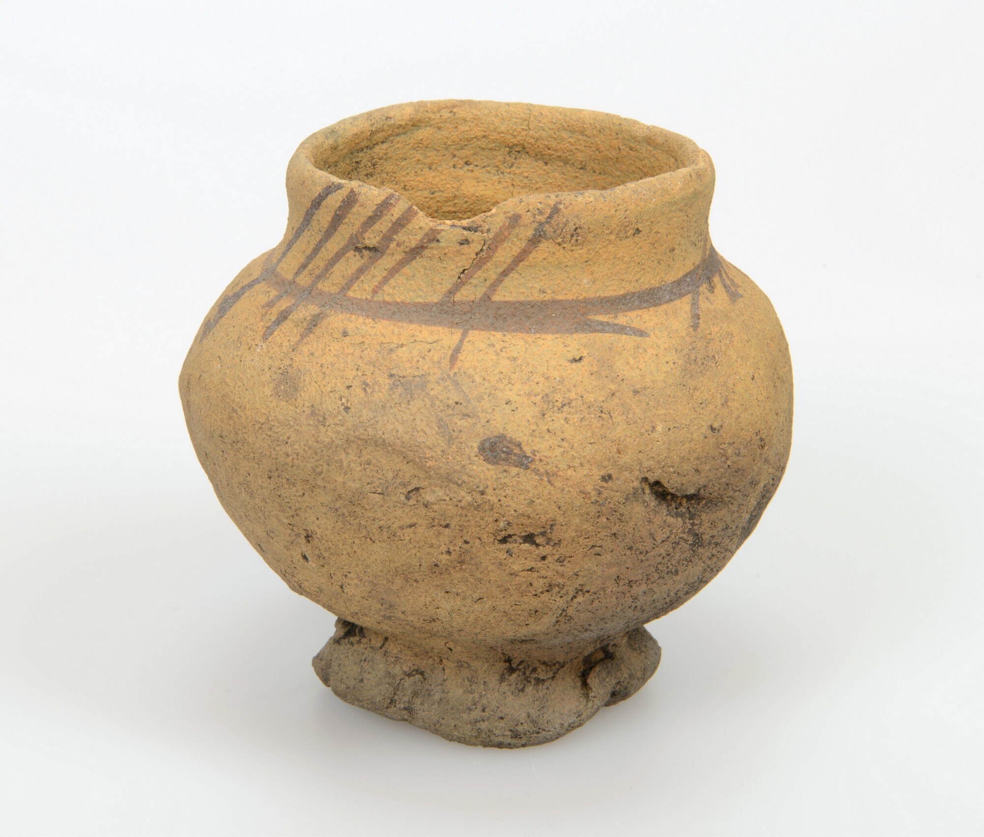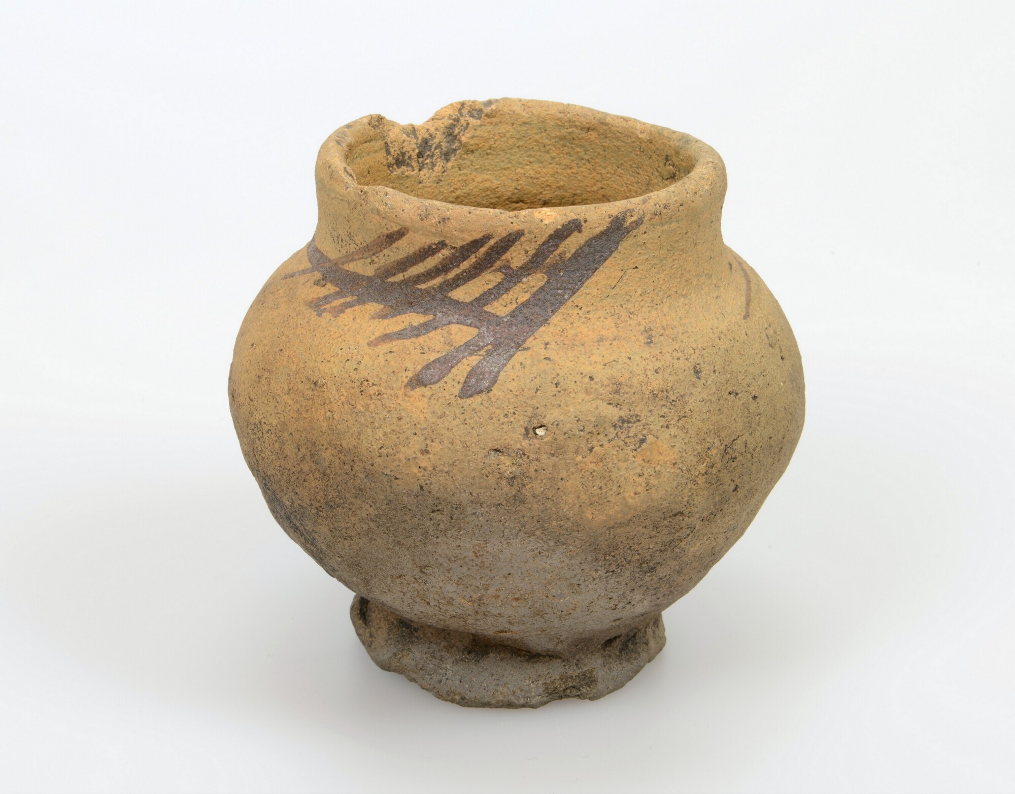 Beker; pi-bek-1; holle beker met hoge schouder en korte licht uitstaande rand, geknepen standring; Pingsdorf-type aardewerk; versiering: doorlopende lijn en diagonale streepjes van ijzerengobe op de schouder; herkomst: Pingsdorf, Rijnland