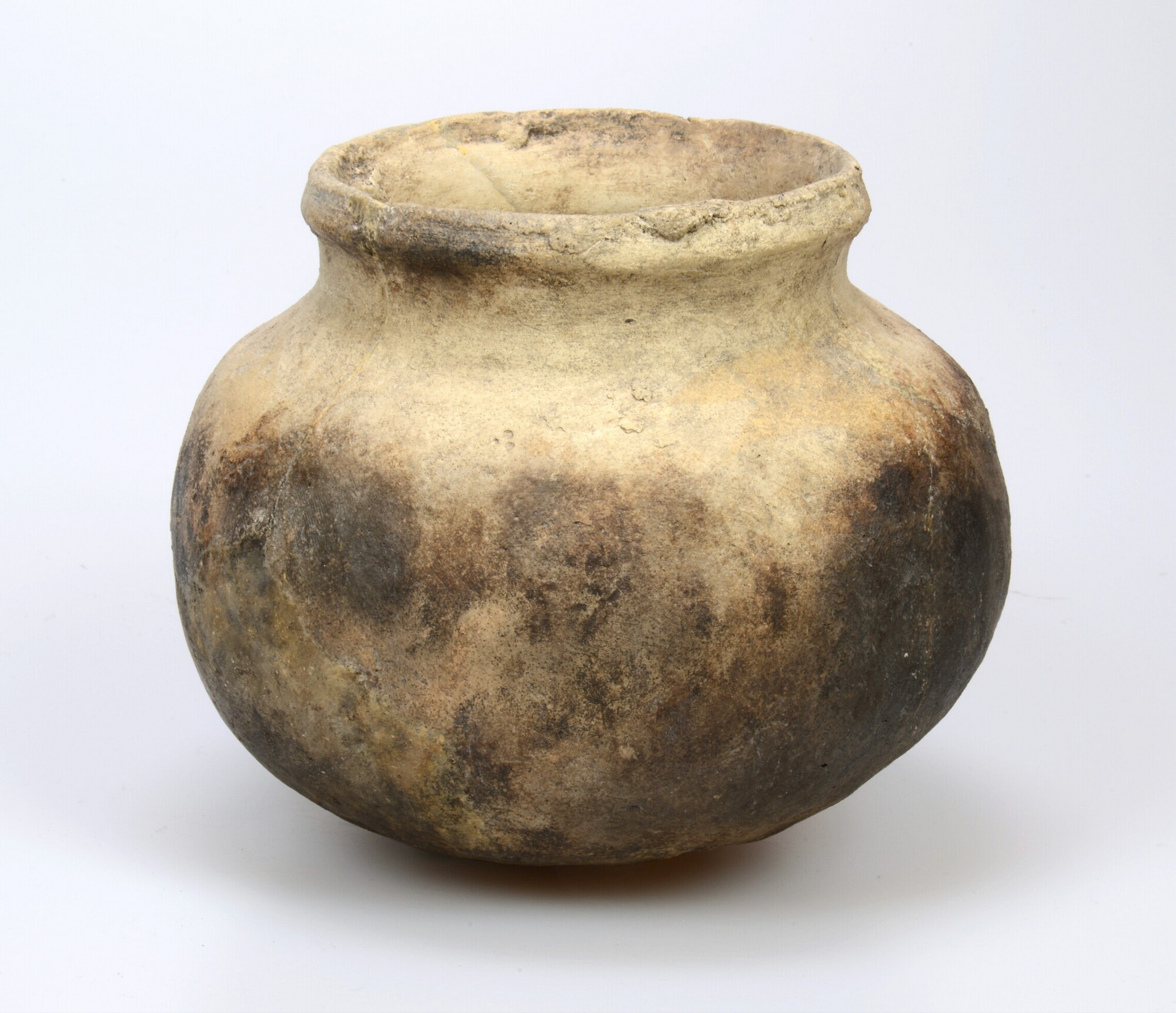 Kogelpot; bolvormig pot met lensvormige bodem en rechtopstaande manchetrand (Midwoud vierkante type 3A); steengruismagering; herkomst: Pingsdorf