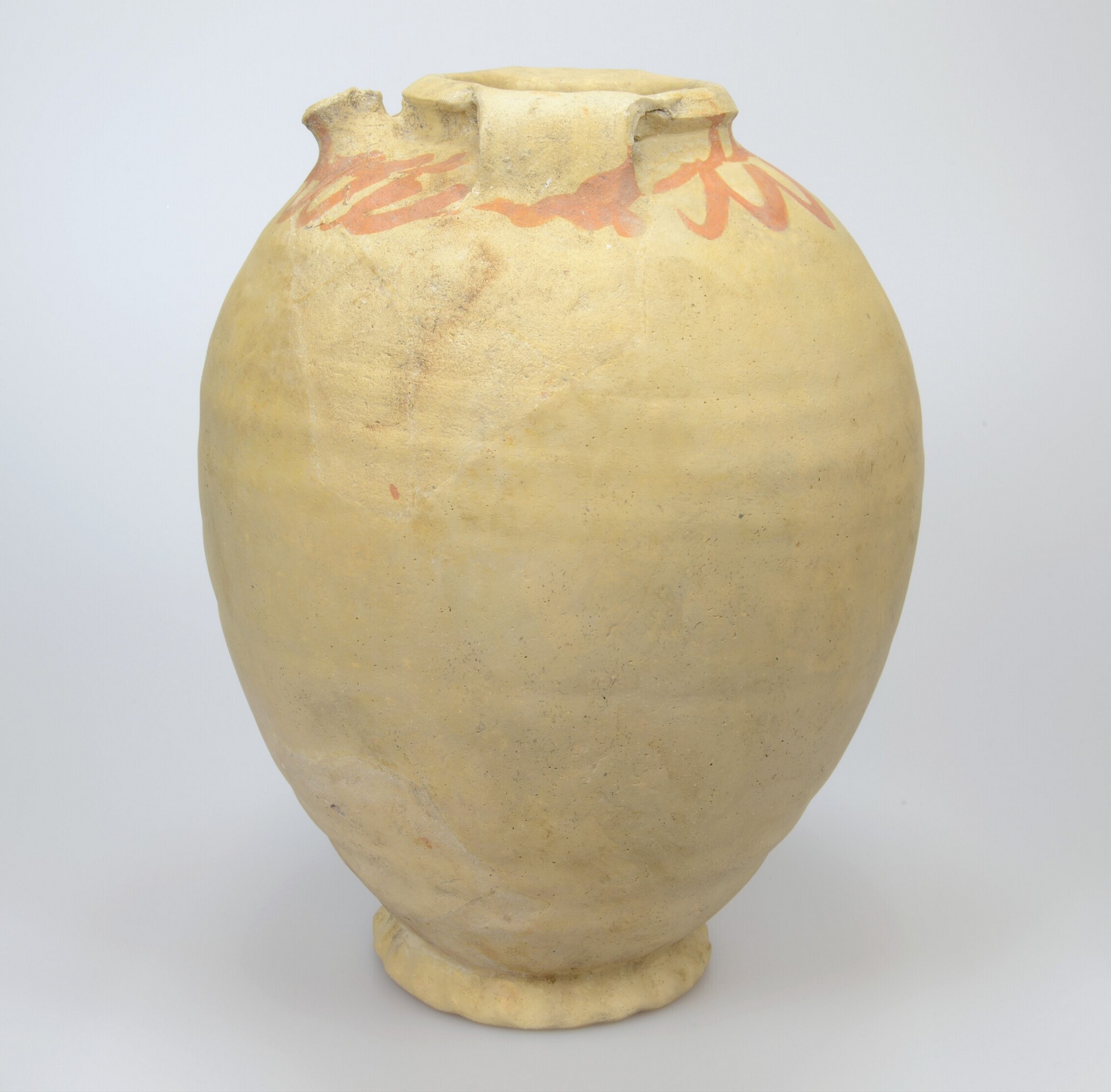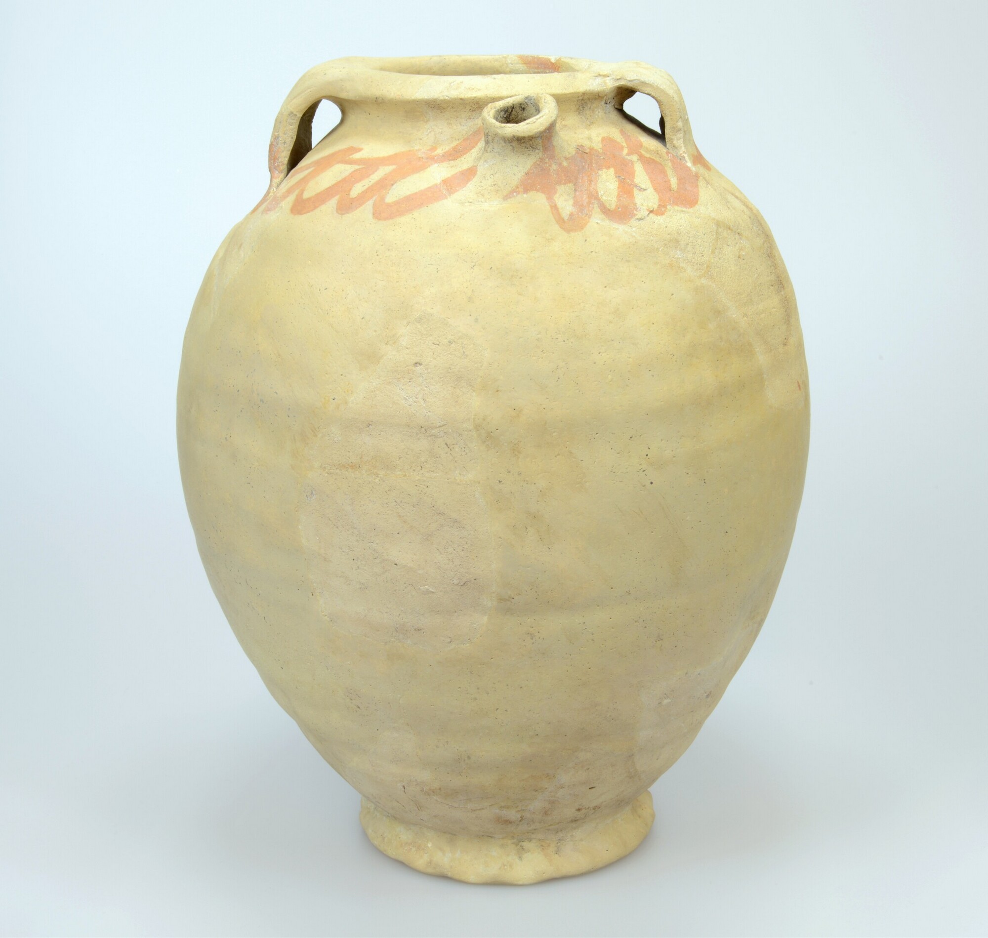 Tuitpot; pi-pot; bolvormige pot met twee bandoren en ronde tuit net onder de rand; randprofiel is dakvormig afgeschuind (Midwoud type 5) ijzerengobe-versiering (komma versiering) onder de rand op de hals; aangeknepen voet; herkomst: Pingsdorf
