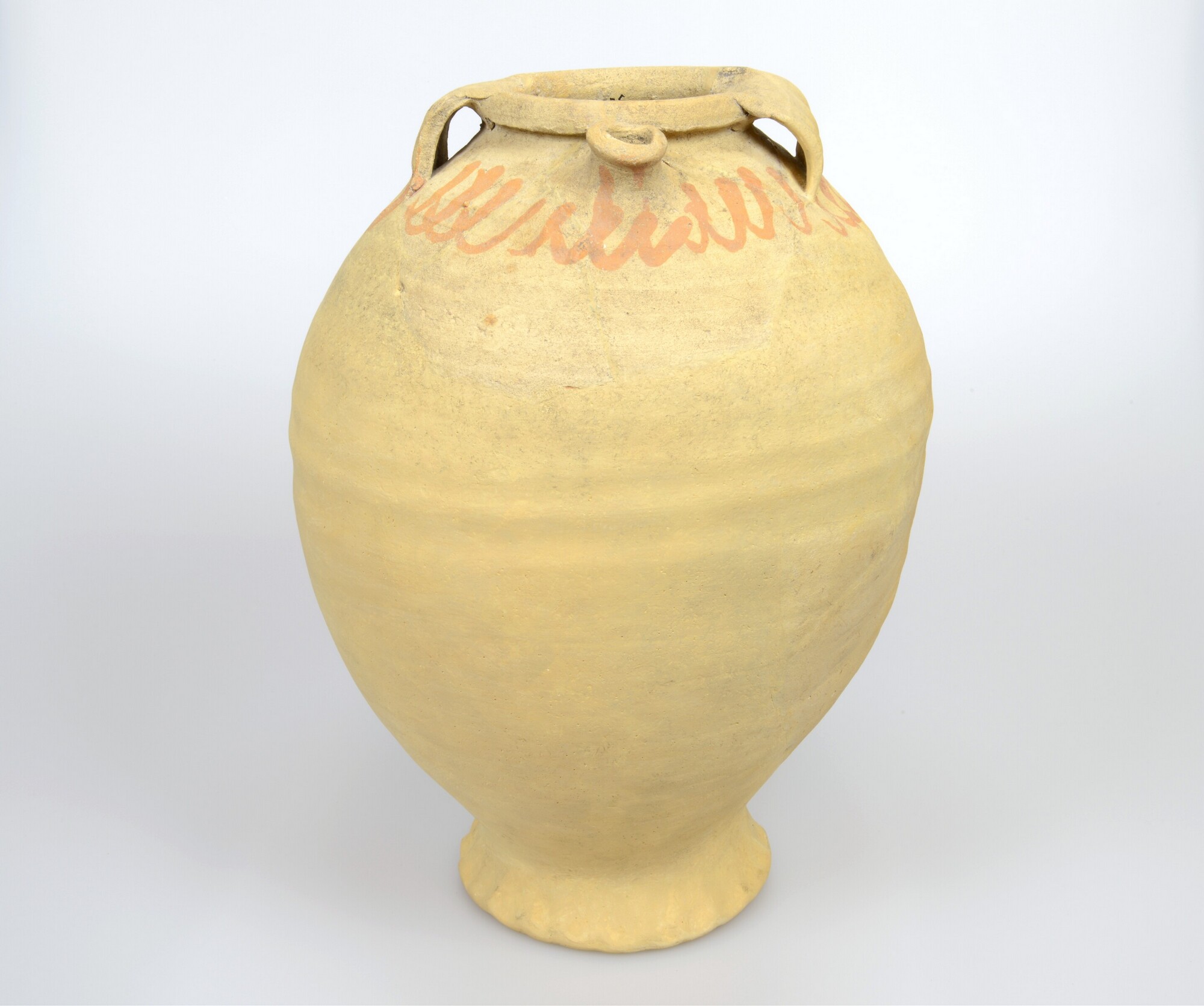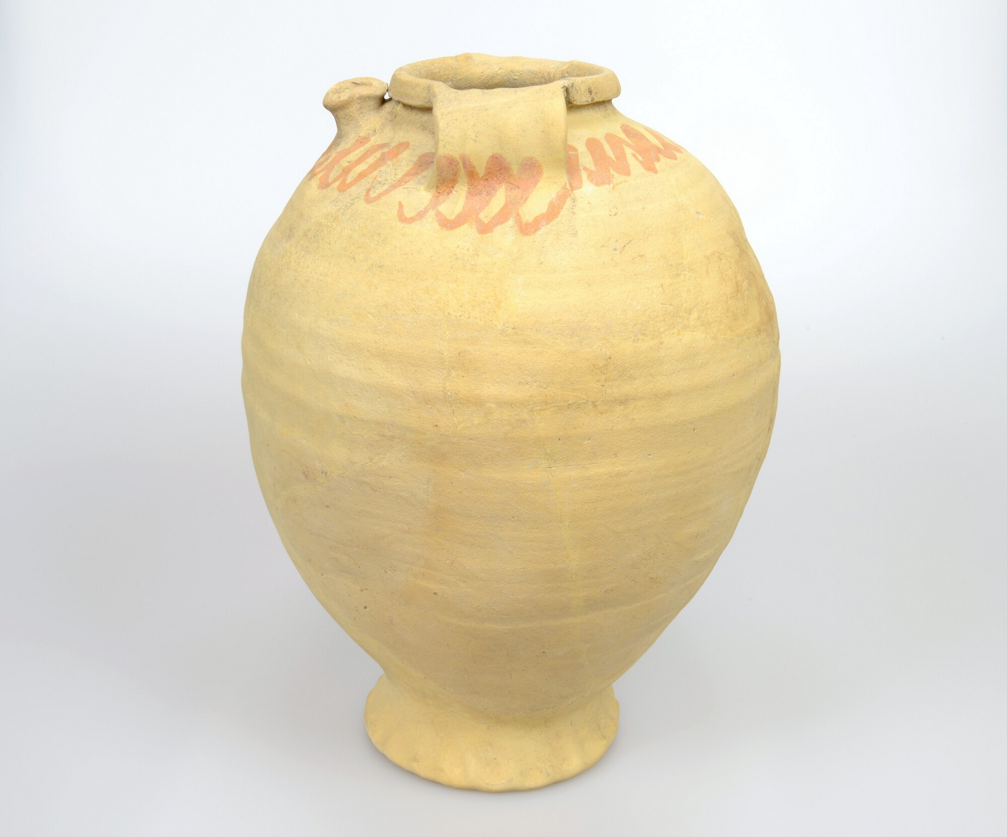 Tuitpot; pi-pot-; bolvormige pot op hoge, geknepen standring met tuit en twee bandoren; randprofiel is dakvormig afgeschuind (Midwoud type 5); oranje golvende ijzerengobe versiering op de schouder; geel/wit baksel