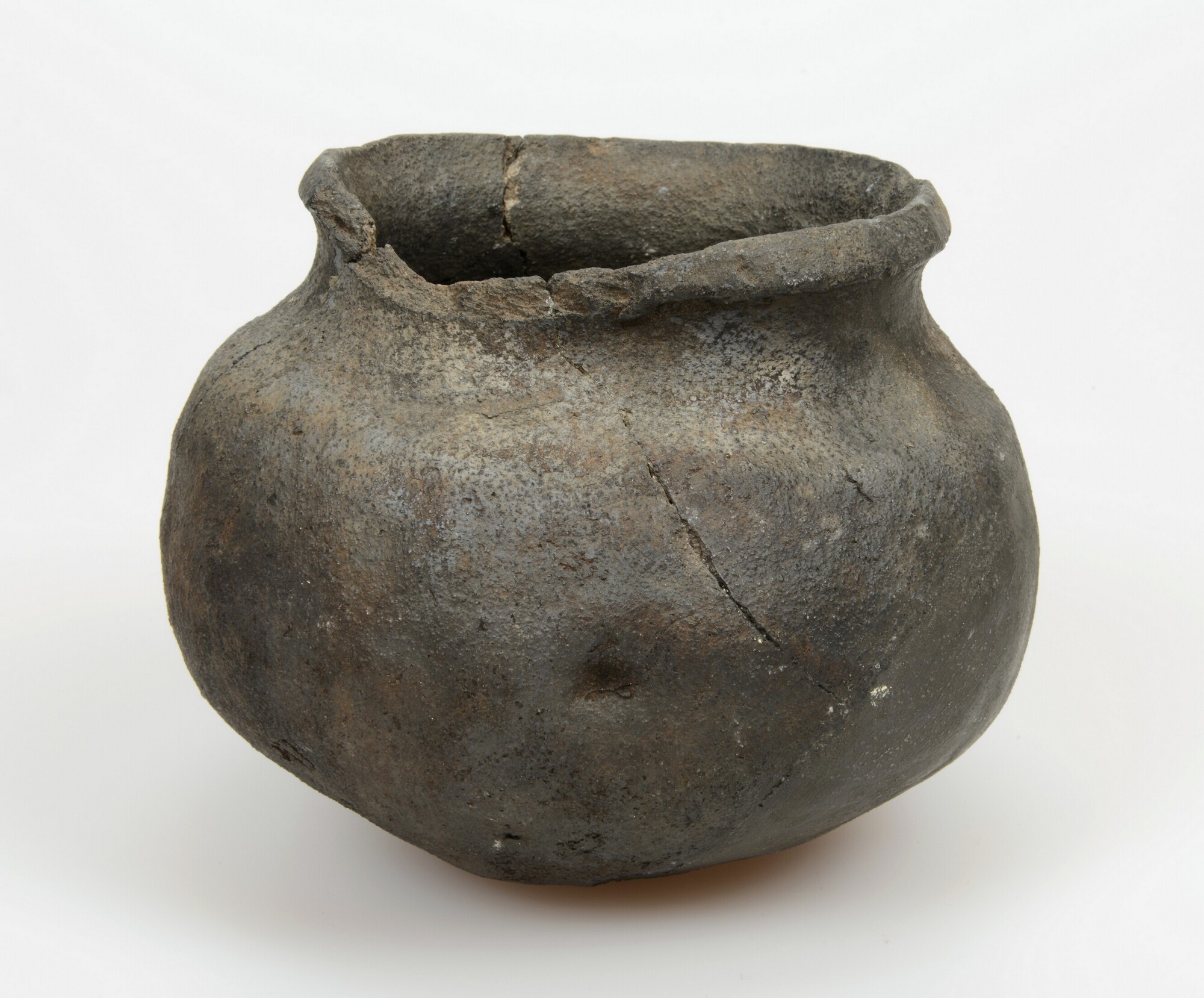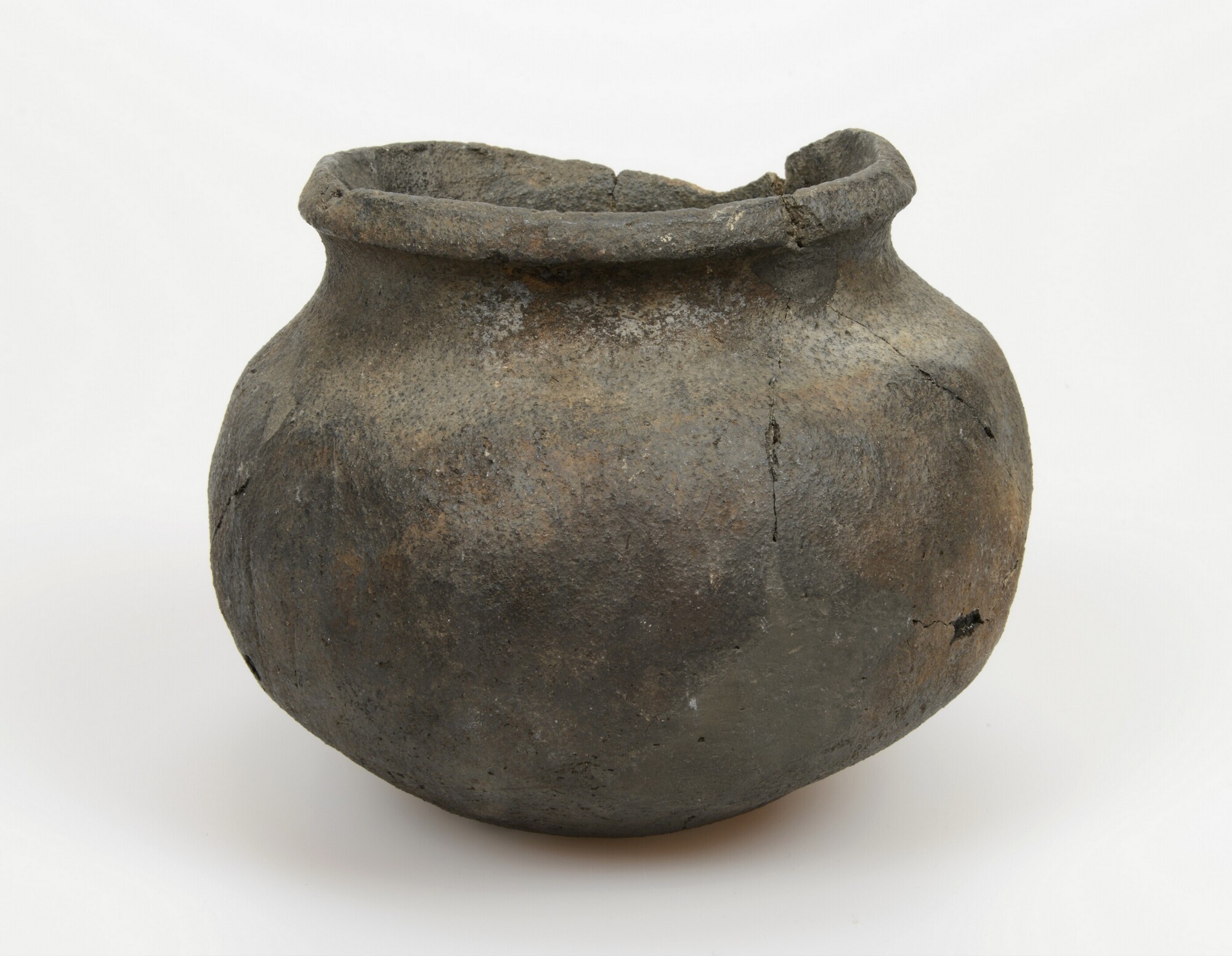 Kogelpot; bg-kog-2; bolvormige pot met scherpe, dakvormig afgeschuinde rand en lensvormige bodem; Paffrath-aardewerk; herkomst: Paffrath, Rijnland