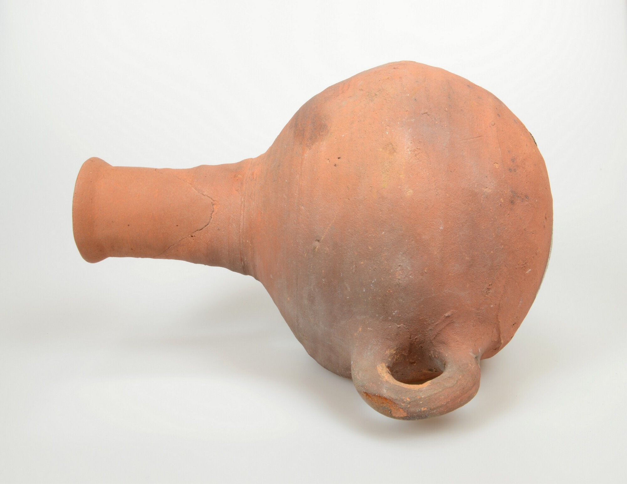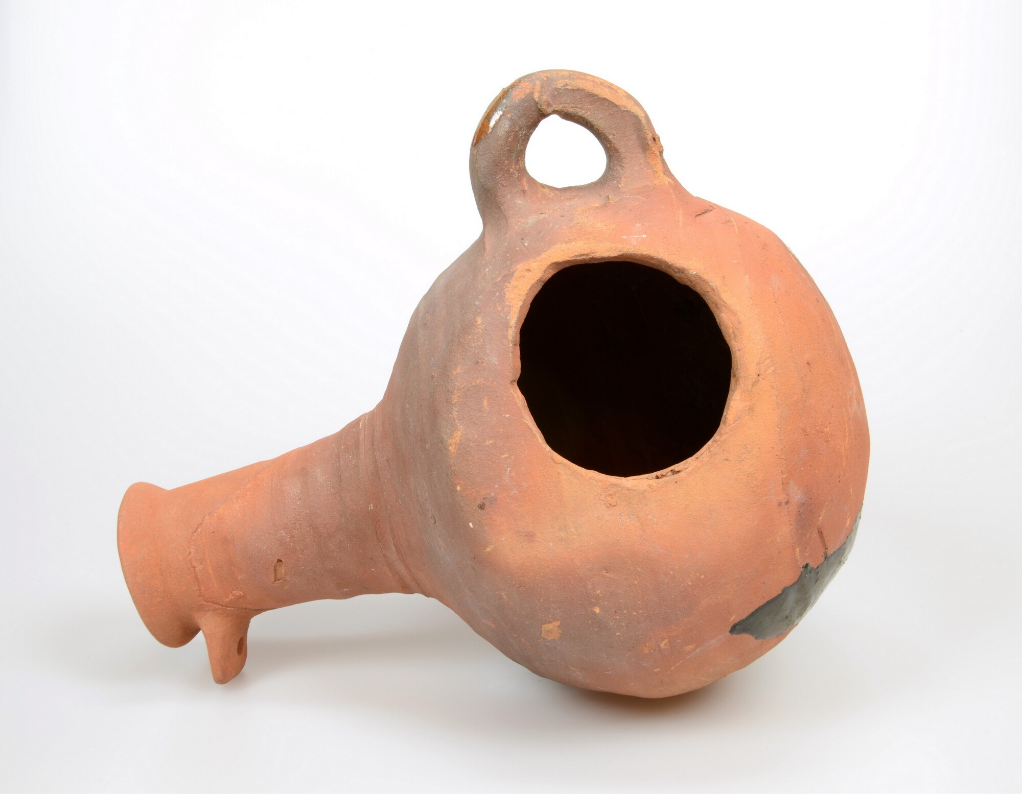 Spreeuwenpot; r-spr-1; peervormige spreeuwenpot met doorboorde nok voor aanvliegstok en roofgat aan afgeplatte achterzijde, ophangoor (verticaal worstoor); roodbakkend aardewerk; spatten loodglazuur; herkomst: Nederland
