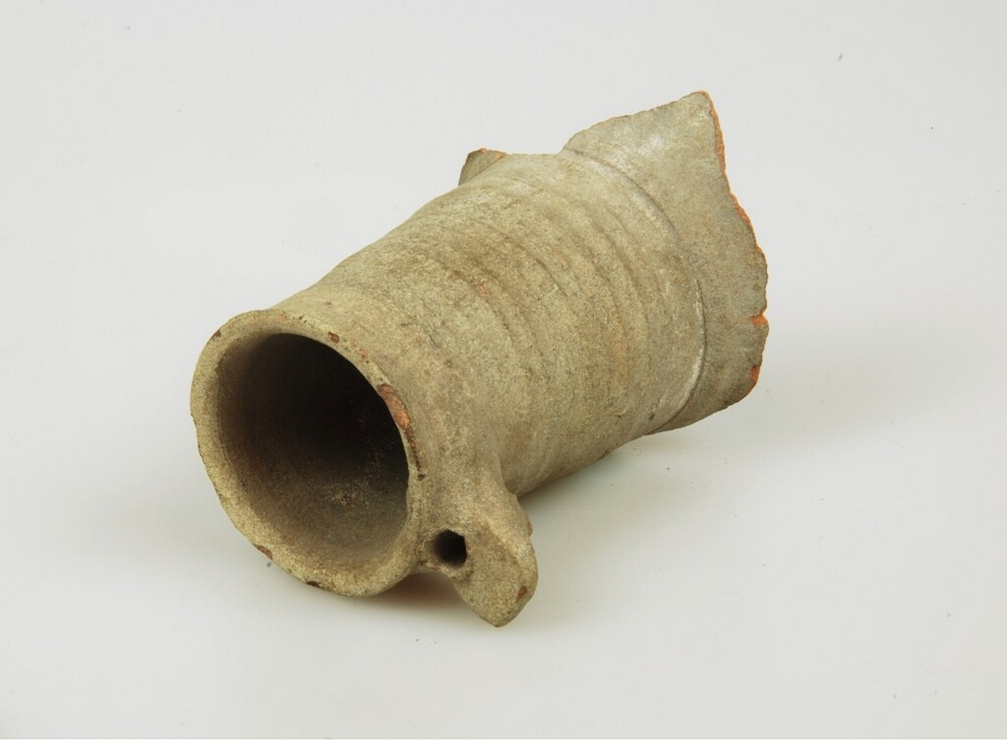 Spreeuwenpot; r-spr-1; deel van; roodbakkend aardewerk; montuur voor aanvliegstok, ongeglazuurd