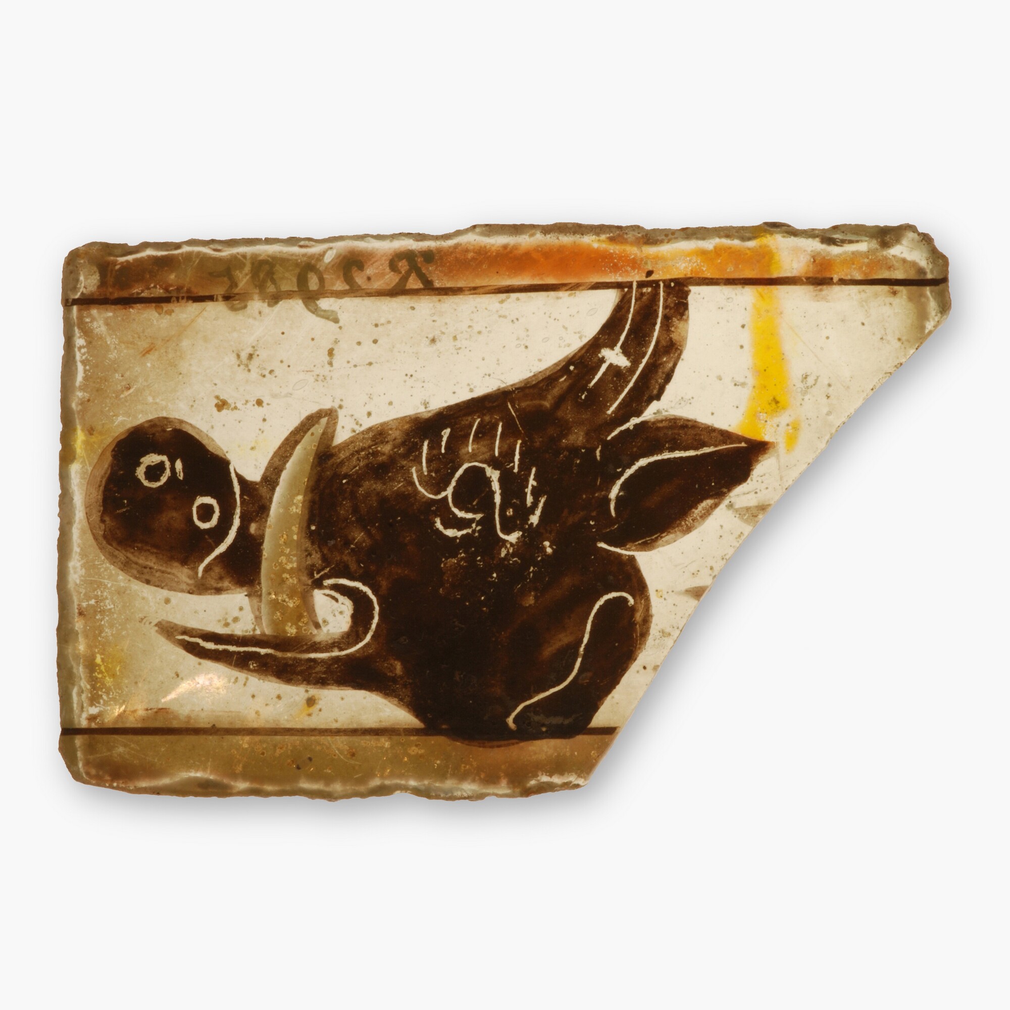 Vensterglas; gl-rui-; rechthoekig; kleurloos gebrandschilderd glas; geschilderde zwijnskop in blauw, geel en bruin, rode lijnen langs de rand; details als oog, snuit en oren in de verf gekrast; herkomst: Noordelijke Nederlanden
