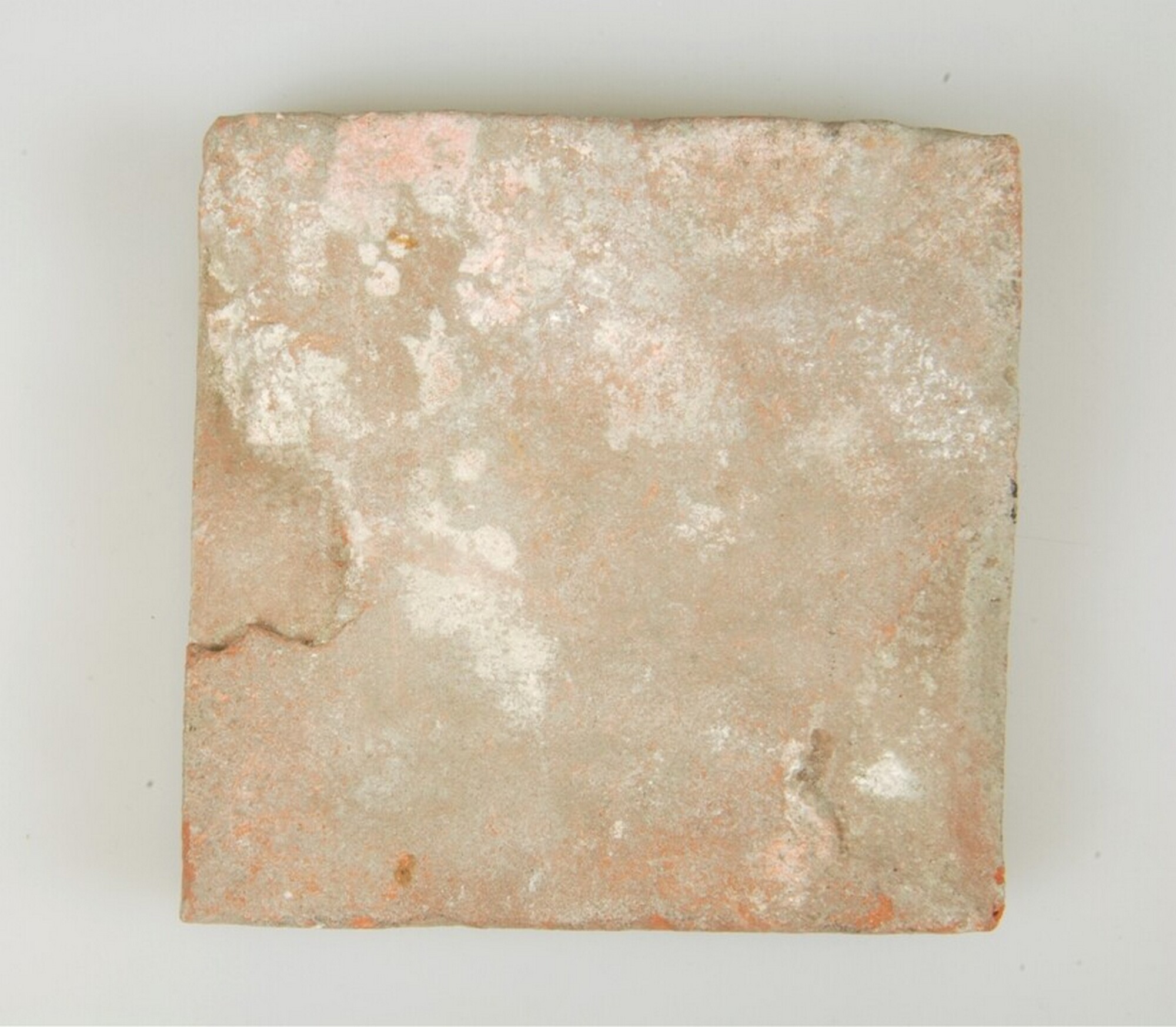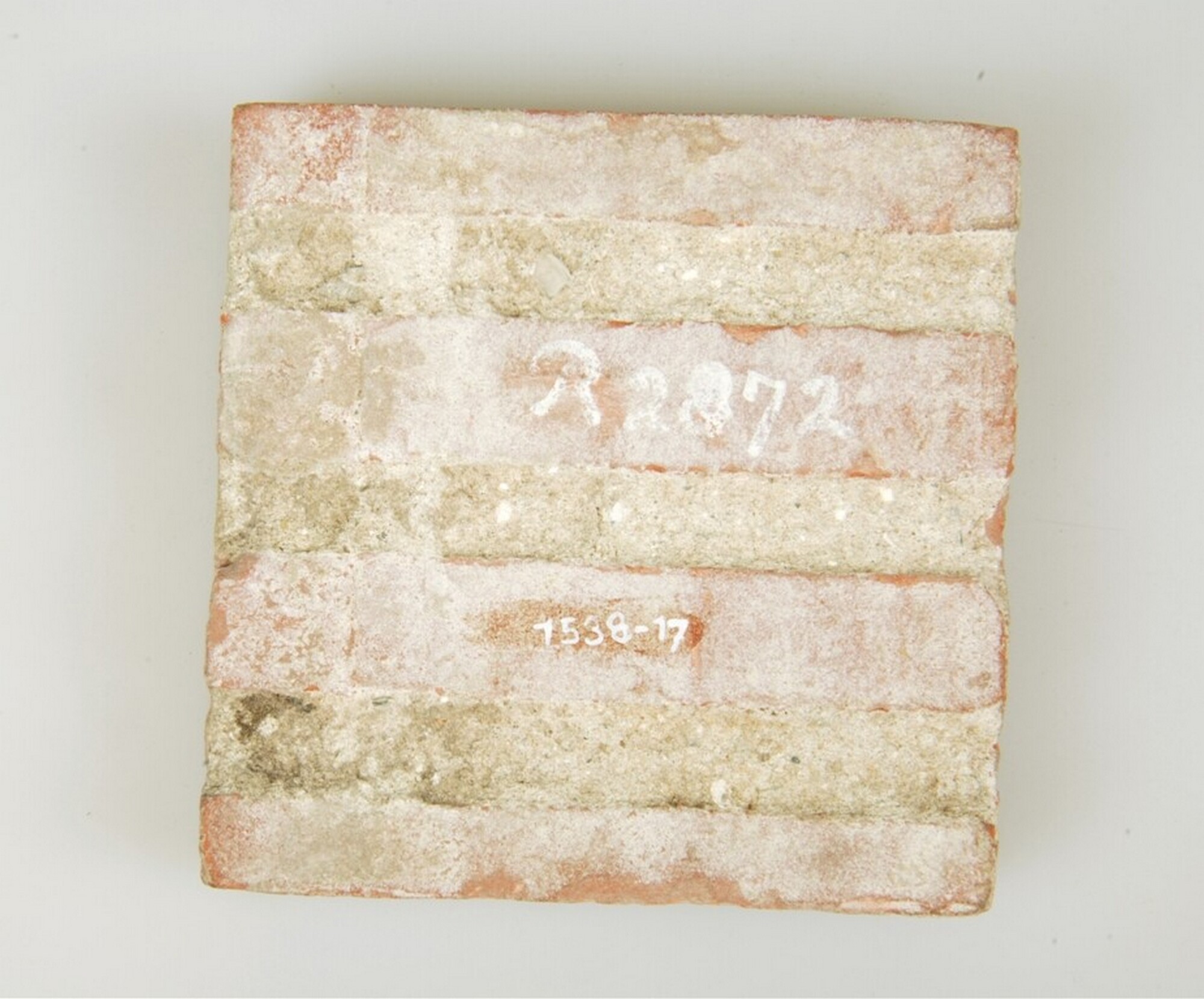 Plavuis; roodbakkend aardewerk; ongeglazuurd; onderzijde met geulen; afgevlakte bovenzijde; mortelresten; herkomst: Nederland; De Stuers (19e eeuwse vondst)