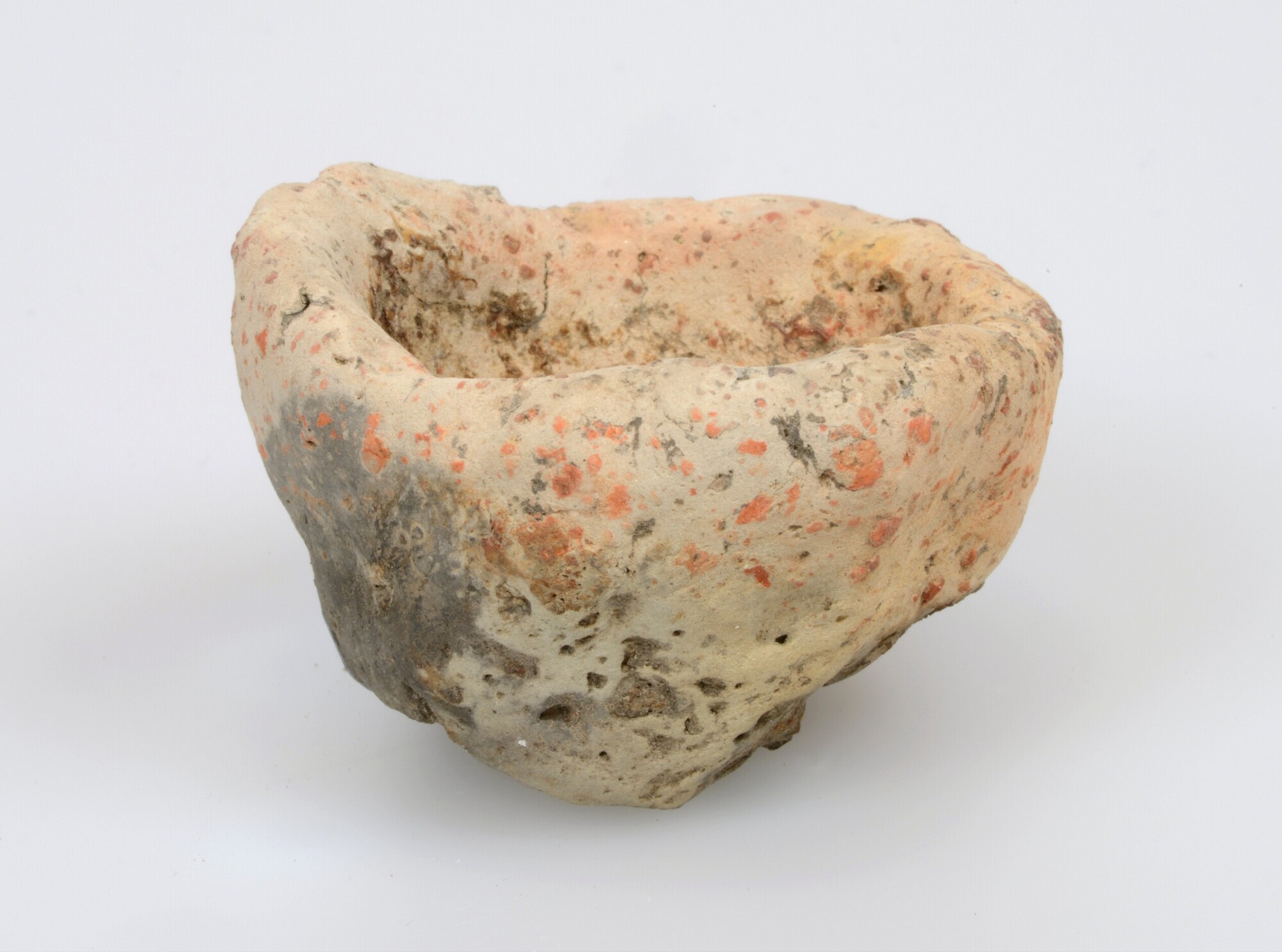 Smeltkroes; handgevormd aardewerk; onregelmatige vorm; lensvormige bodem; fijne (rode) aardewerkgruis magering