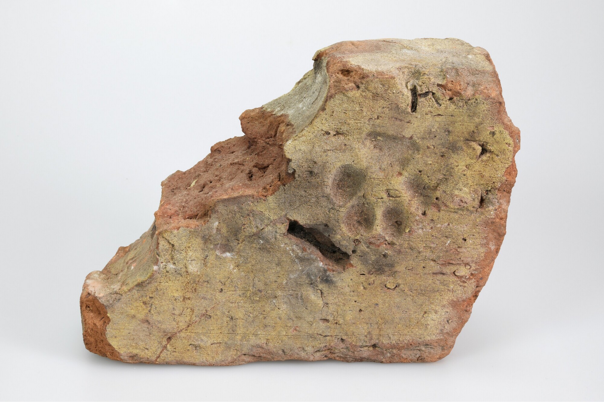 Profielsteen met pootindruk; baksteen; bouwonderdeel; roodbakkend