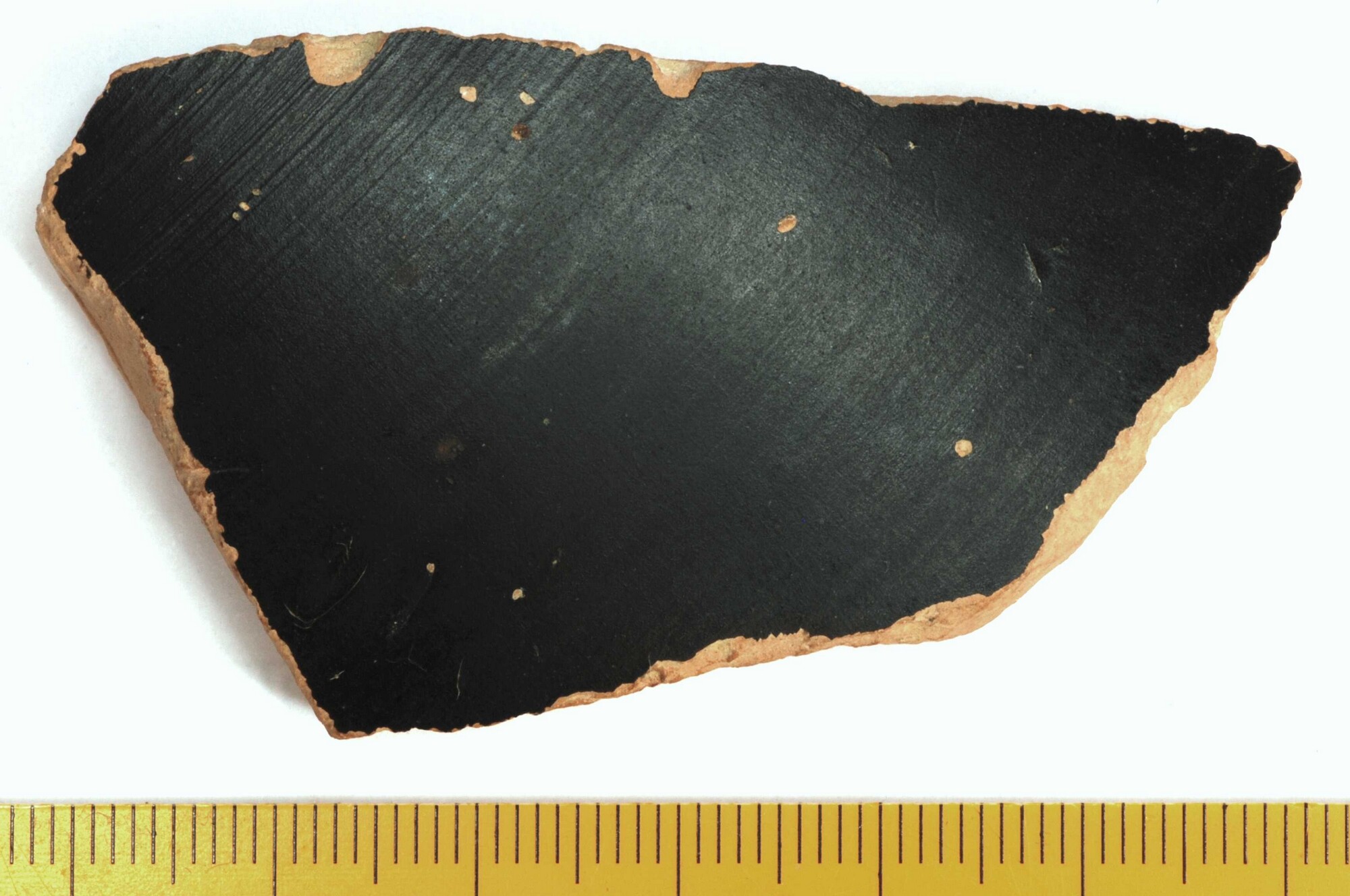 Scherf van Attisch aardewerk; deel tussen een eventueel decoratief beschilderde buik en standvoet; lekythos, hydra of amfoor; baksel is zeer fijn en zonder magering. De kleur is oranje met een egale zwarte deklaag op de buitenkant. Hierin zijn zeer fijne richels zichtbaar, als sporen van het afwerken van de pot voorafgaande aan het aanbrengen van ...