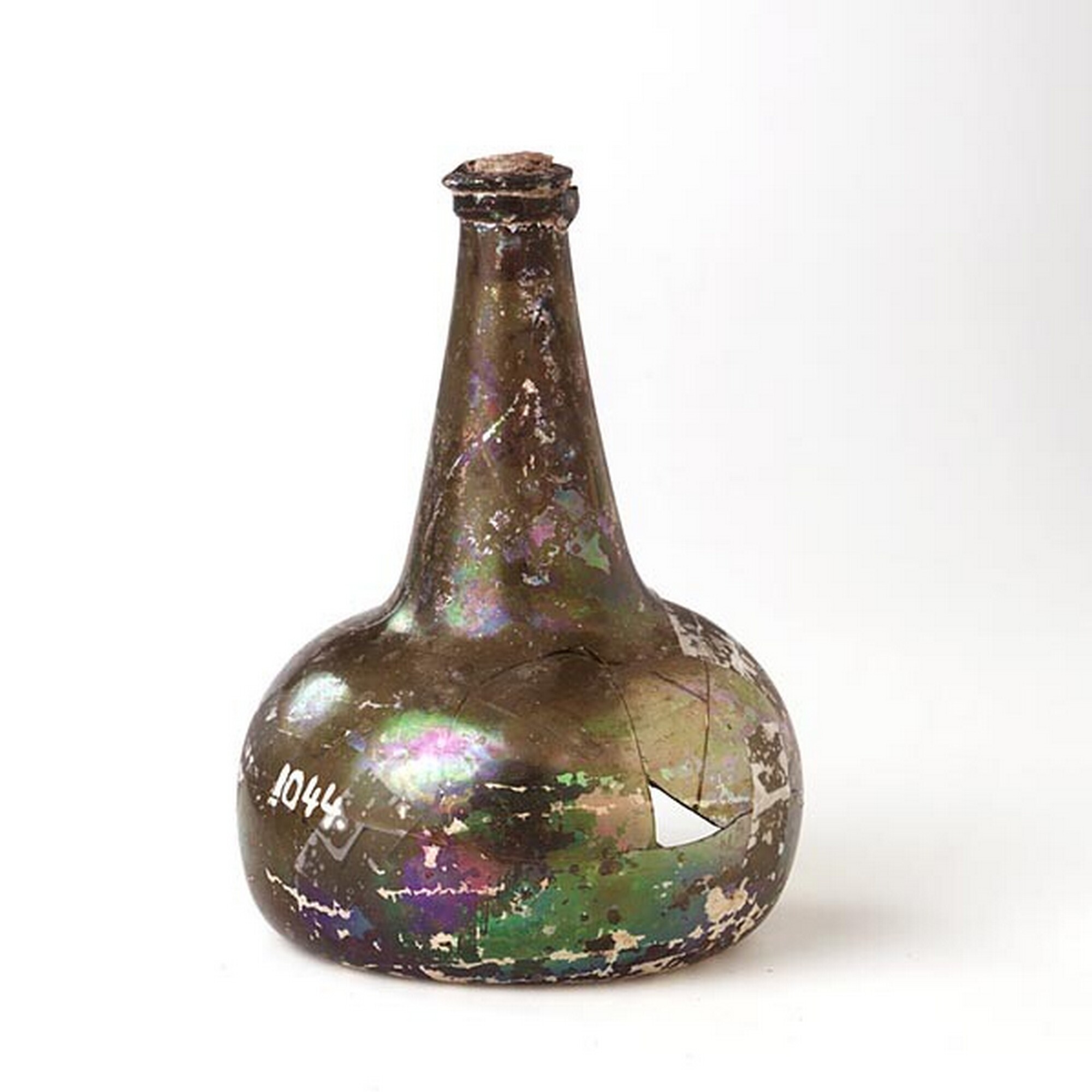 Wijnfles:hoge hals, opgebolde bodem