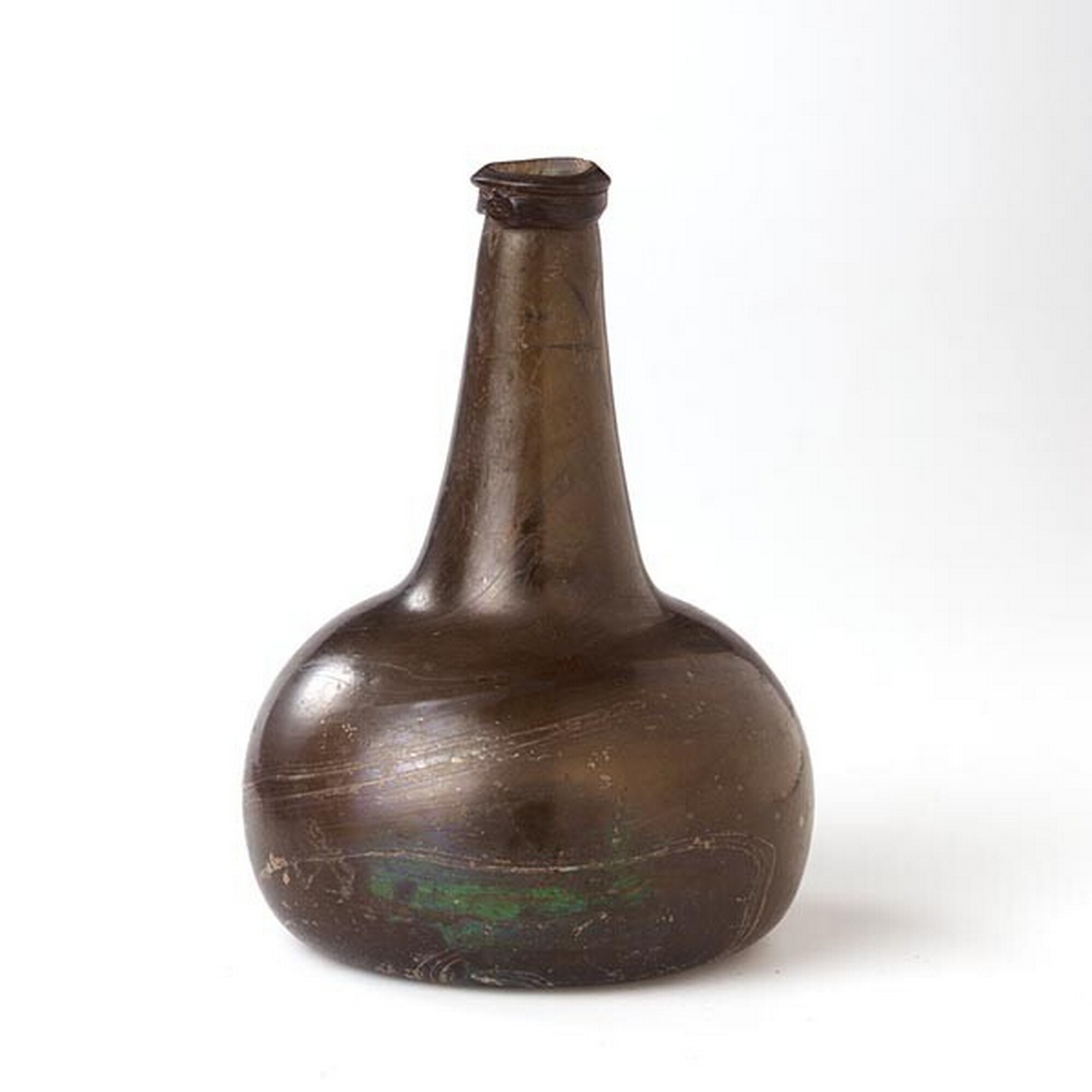 Fles; gl-fle-; uivormige (union), donkergroen/bruin glas met halsdraad, opgestoken bodem en pontilmerk; wijnfles