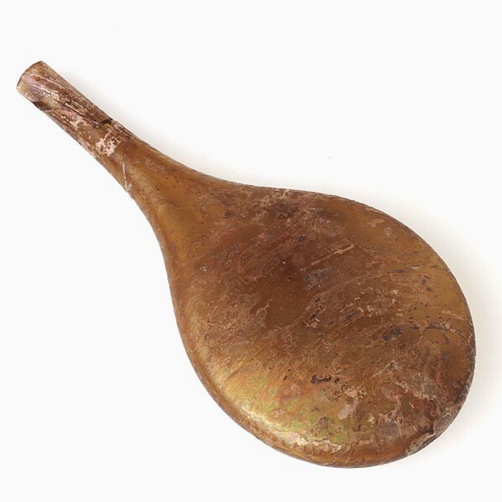 Spawaterfles; gl-fle-18; geelgroen; platte fles met lange hals; mondrand niet afgewerkt; klein plat vlakje aan de bodem en geen pontilmerk; herkomst: Luik; vondstdatum: 13-8-1935
