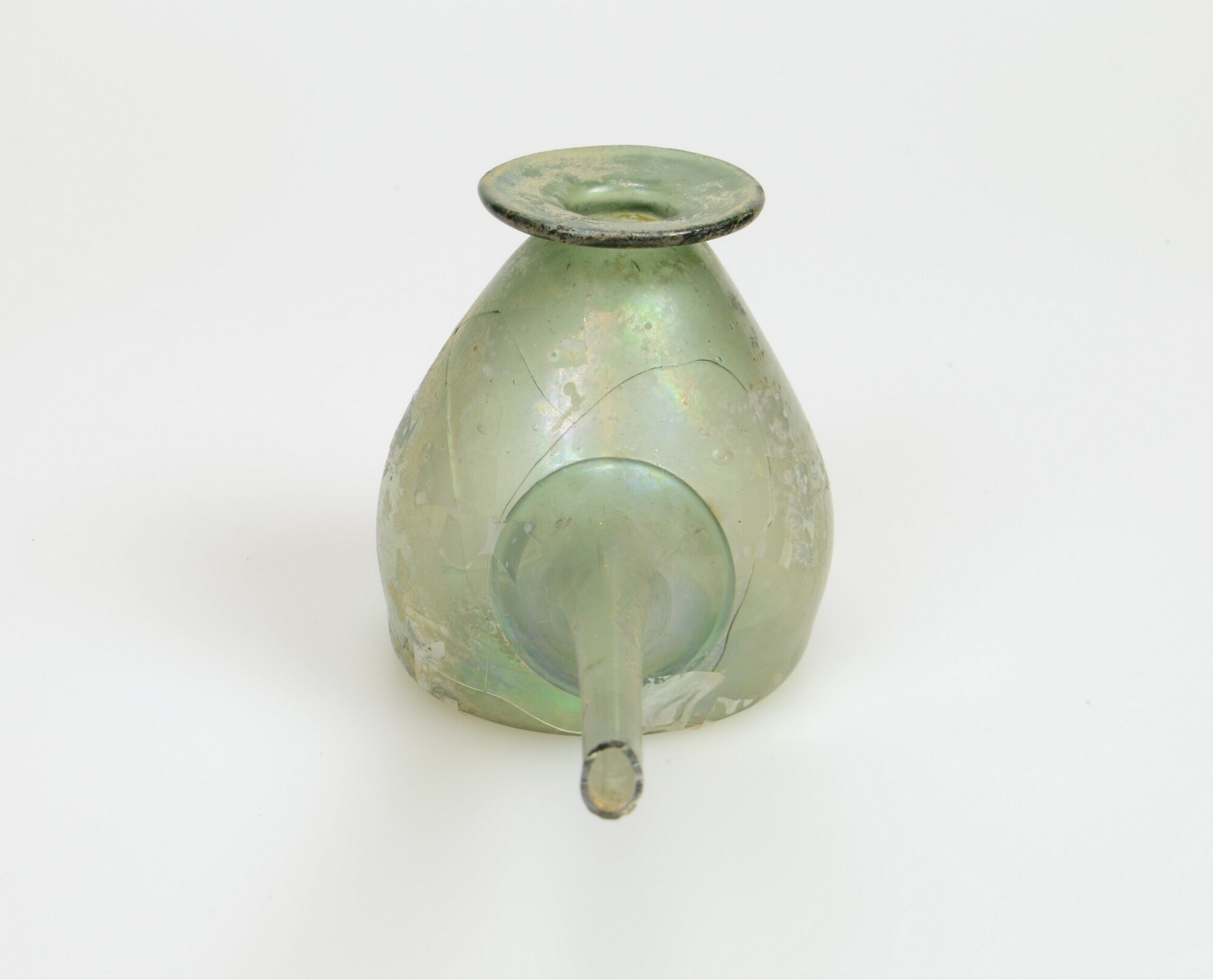 Kolffles/kolfglas; gl-klf-; buidelvormig flesje met brede uitstaande rand en lange smalle tuit aan de zijkant, opgestoken bodem met pontilmerk; lichtgroen glas; herkomst: Nederland of Duitsland; vondstdatum: 13-08-1934