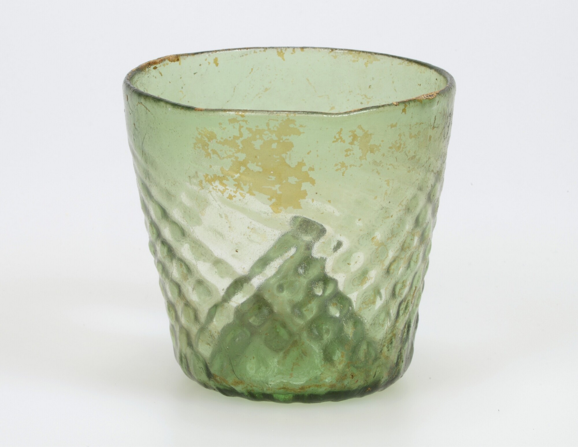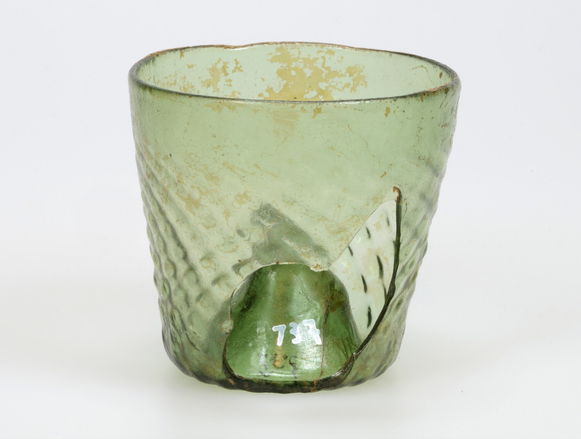 Ribbelbeker; gl-bek-2b; conische beker met gekruist ribbelpatroon, hoog opgestoken bodem met pontilmerk; groen woudglas; herkomst: Duitsland of Henegouwen