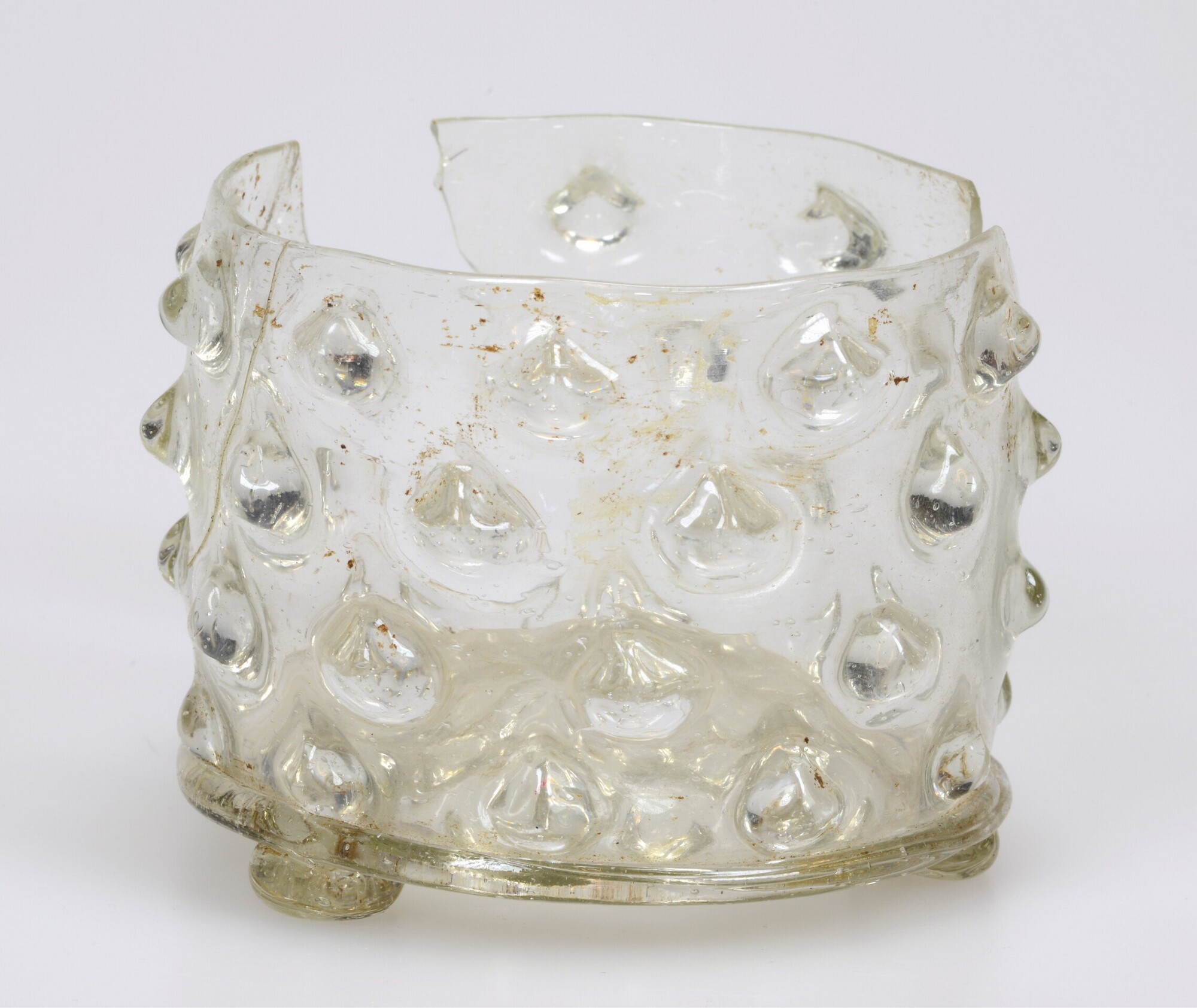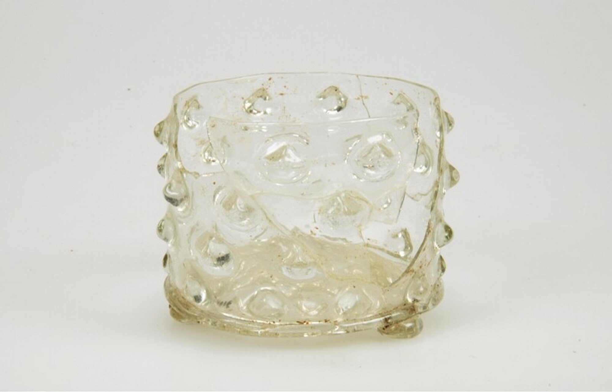 Knobbelbeker; gl-bek-15b; cilindrische beker met knobbelpatroon (rijen van 10 knobbels), opgestoken bodem met pontilmerk, drie noppootjes; kleurloos glas; herkomst: Nederland