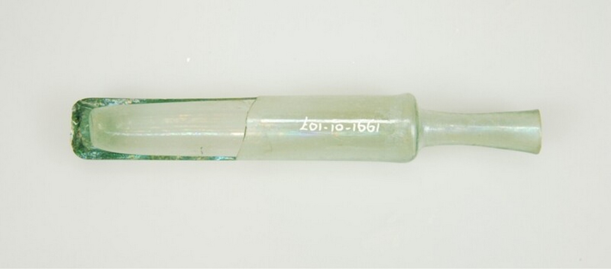 Fles; gl-fle-3; lange, smalle cilindrische fles, met lange conische hals, opgestoken bodem met pontilmerk; glas; lichtblauwgroen; Eau-de-Cologne fles; herkomst: Duitsland/Nederlanden; AWP-code: 1991-01-107