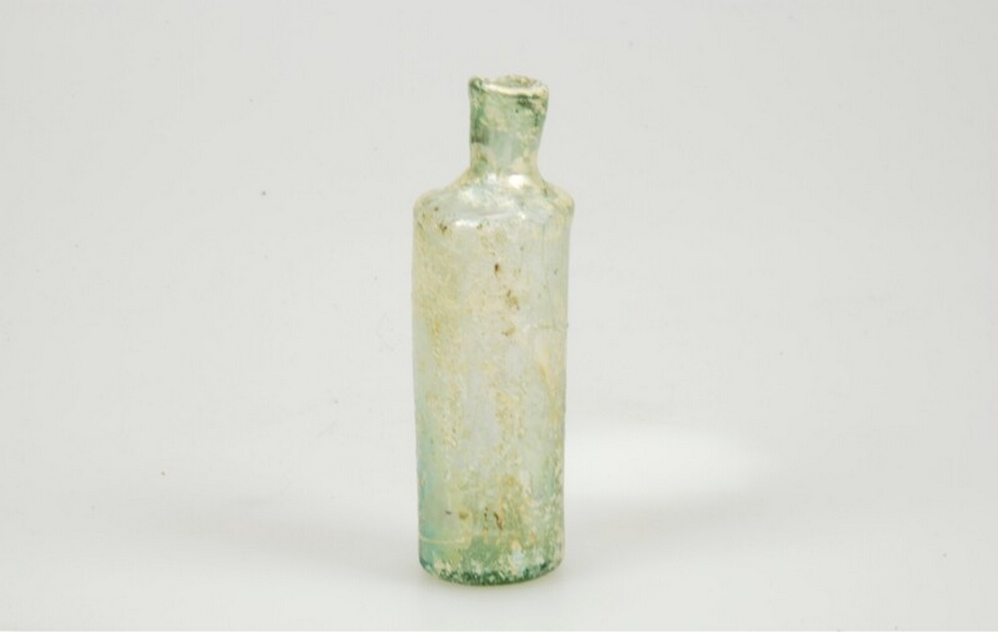 Fles; gl-fle-11; cilindrische medicijnfles met korte hals met uitstaande lip, opgestoken bodem met pontilmerk; glas; groen; herkomst: Duitsland/Nederlanden; AWP-code: 1991-01-87