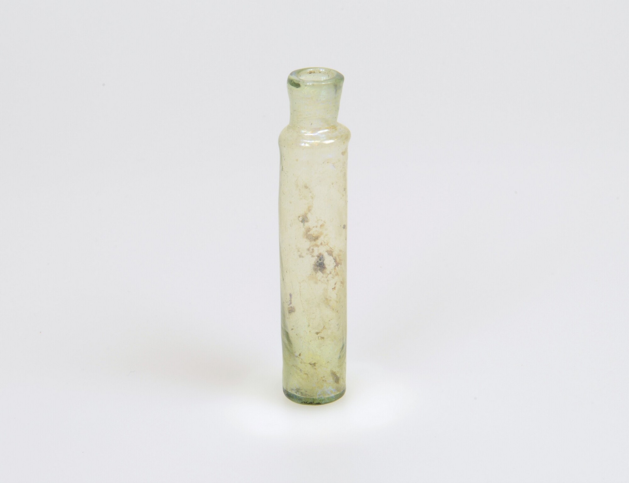 Fles; gl-fle-11; cilindrische medicijnfles met korte hals met uitstaande lip, opgestoken bodem met pontilmerk; groen glas; Haarlemmerolie fles? herkomst: Nederland of Duitsland
