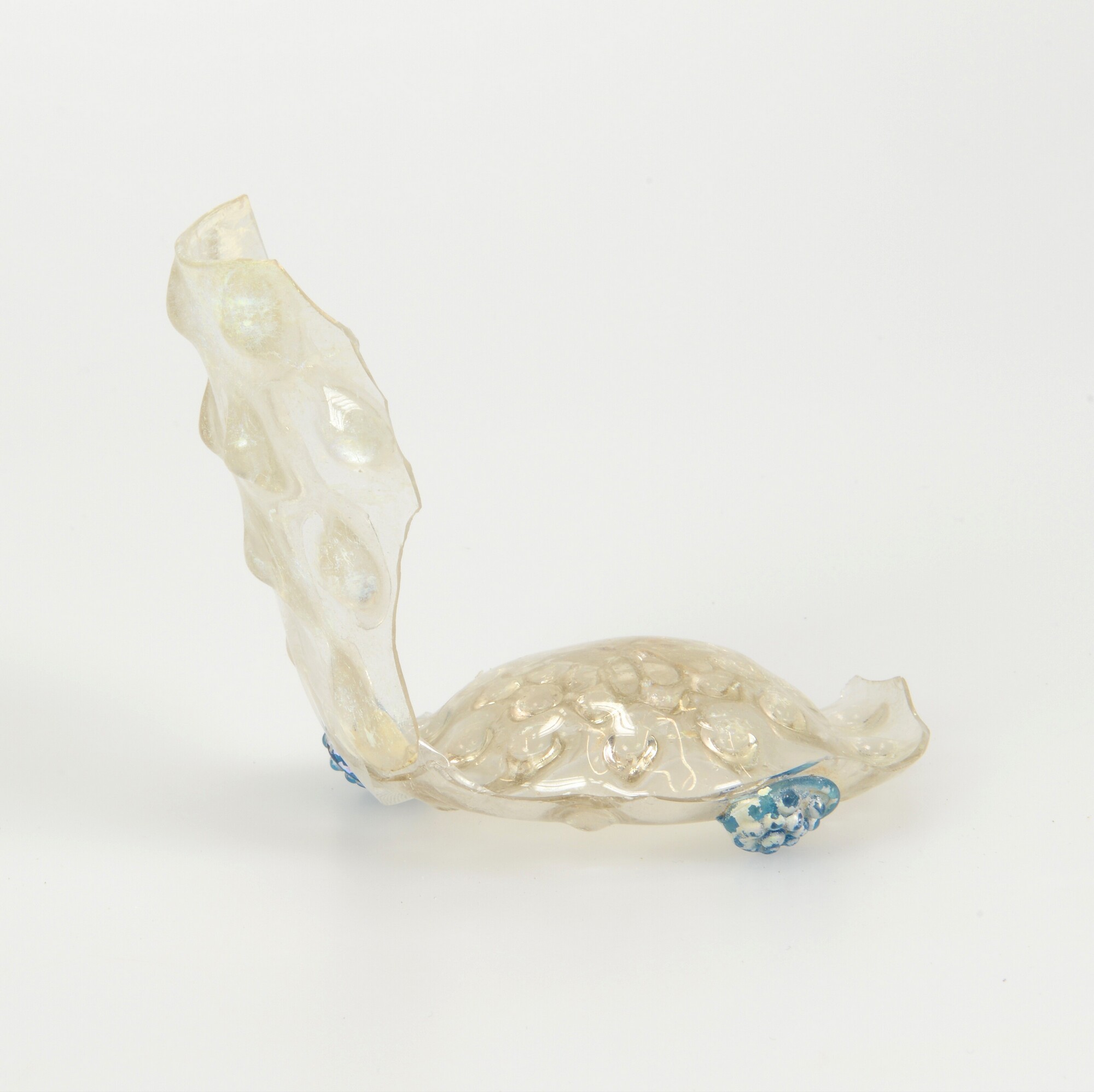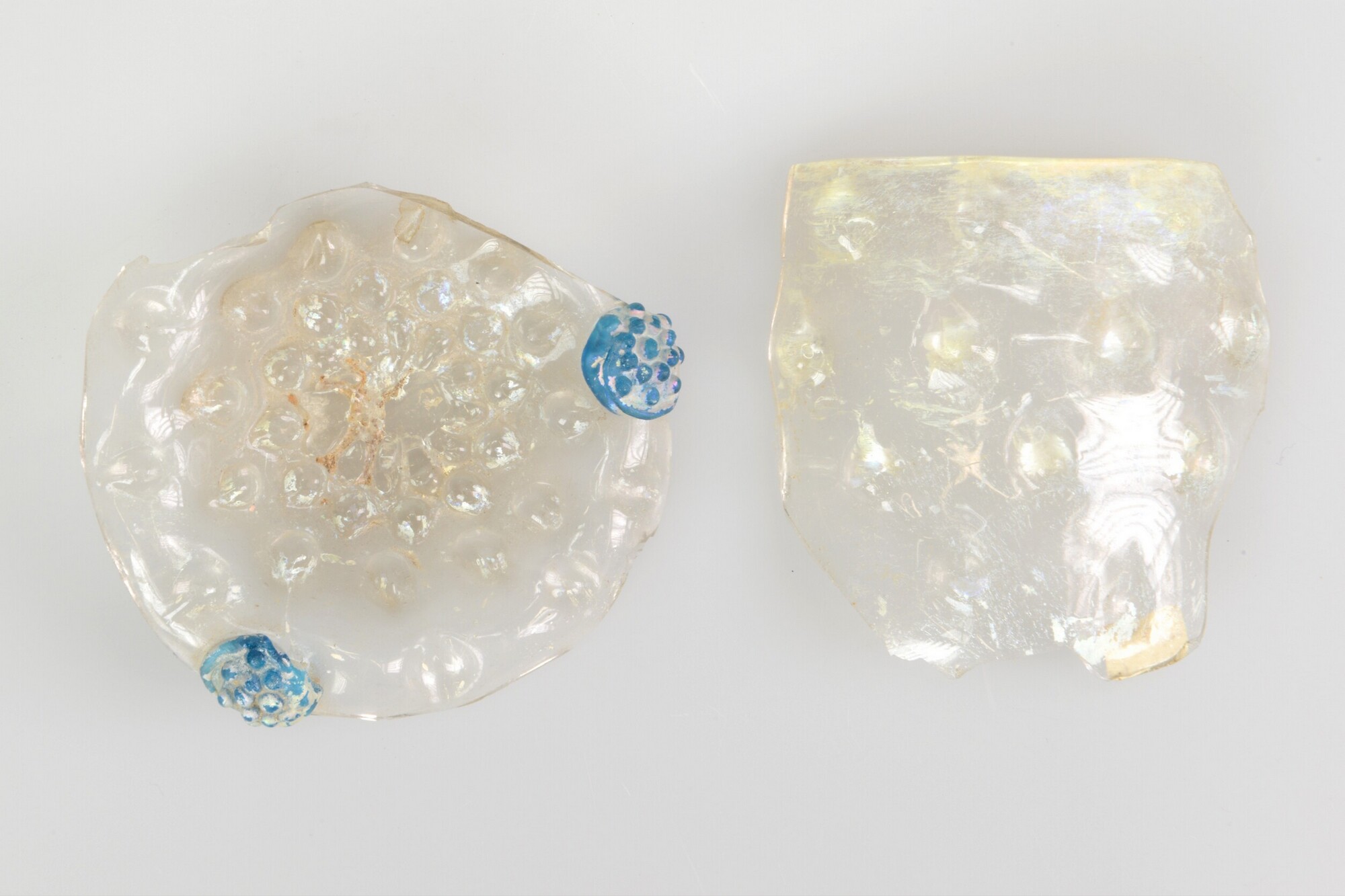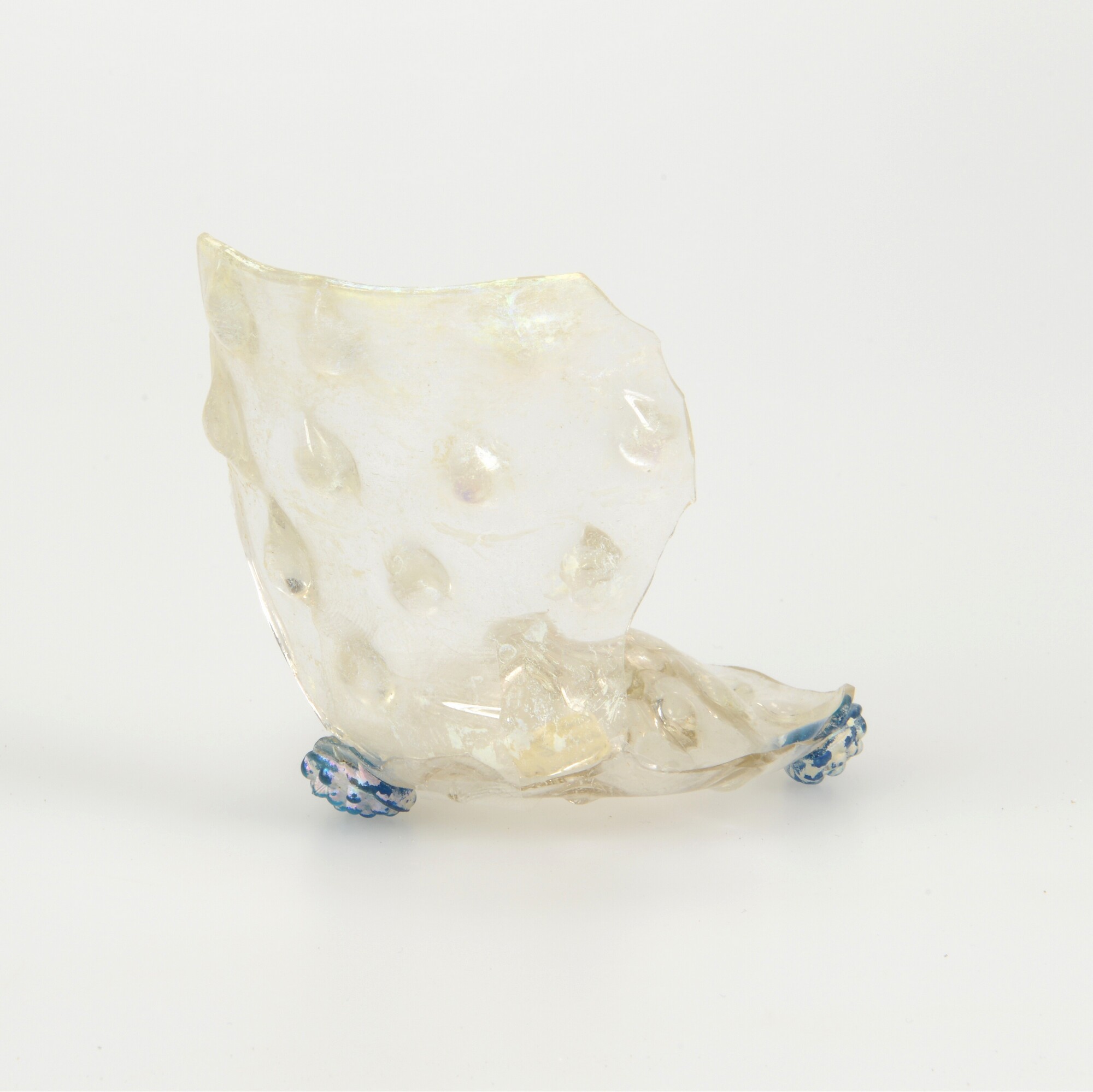 Beker; gl-bek-15b; cilindrische beker met knobbelpatroon, opgestoken bodem met pontilmerk, blauwe braamnoppootjes; kleurloos sodaglas; herkomst: Duitsland of Nederland
