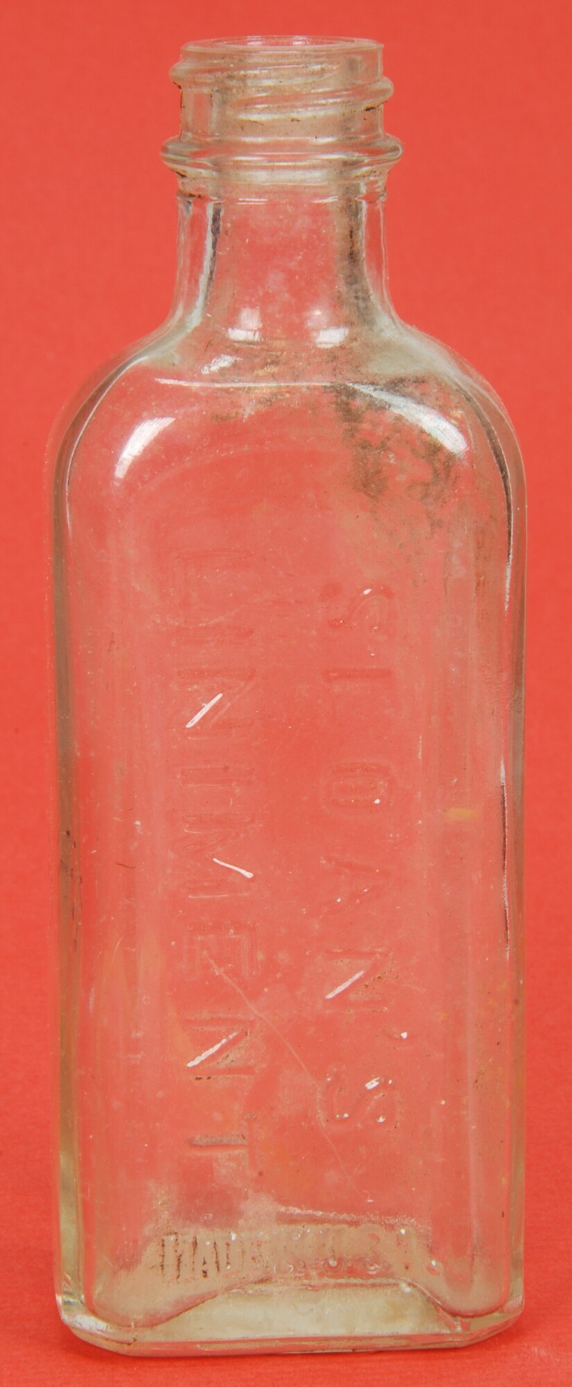 Fles; gl-fle; glas; kleurloos; standvlak; contactvorm, tekst: SLOAN'S LINIMENT MADE IN USA.; balsem (uitwendig gebruik); onderzijde getal 81 (inhoudmaat)