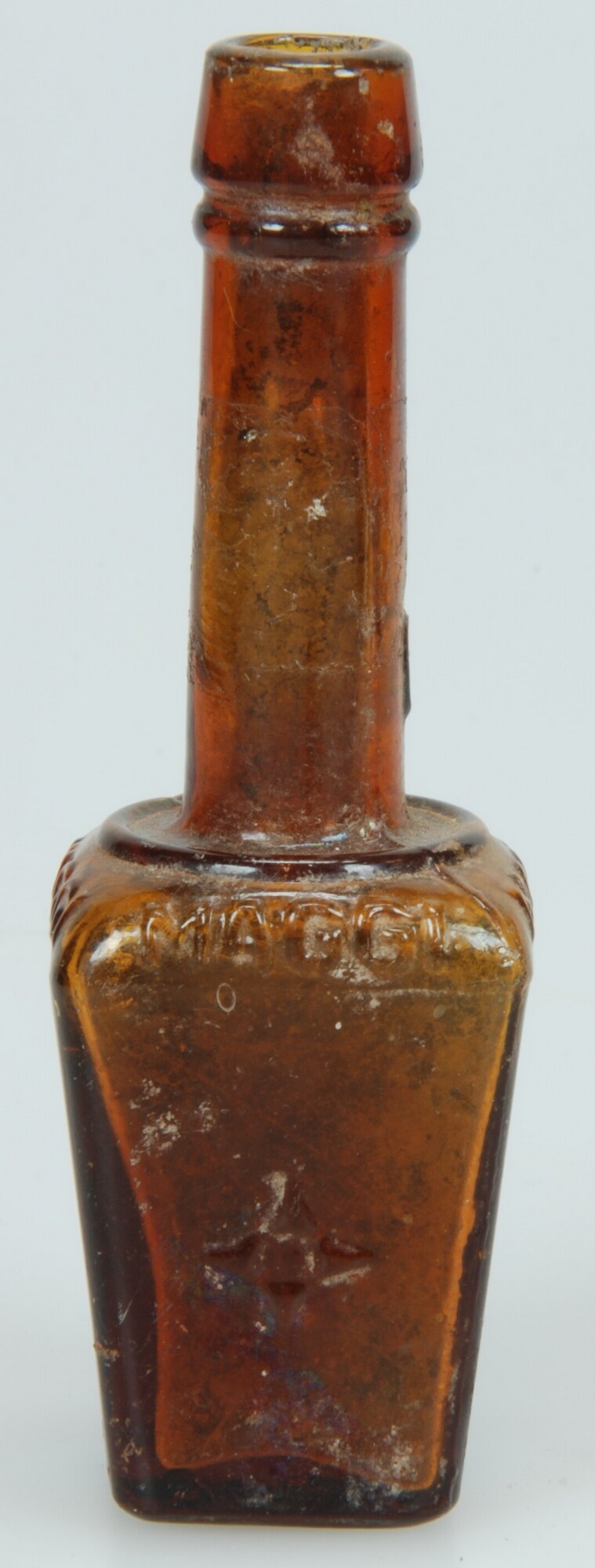 Fles; gl-fle; glas; bruin; standvlak; contactvorm, tekst: MAGGI