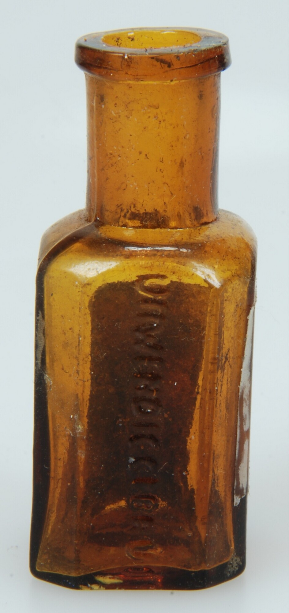 Fles; gl-fle; glas; bruin; standvlak; contactvorm, merk: 8B., tekst: UITWENDIG GEBRUIK/ USAGE EXTERN; medicijnfles