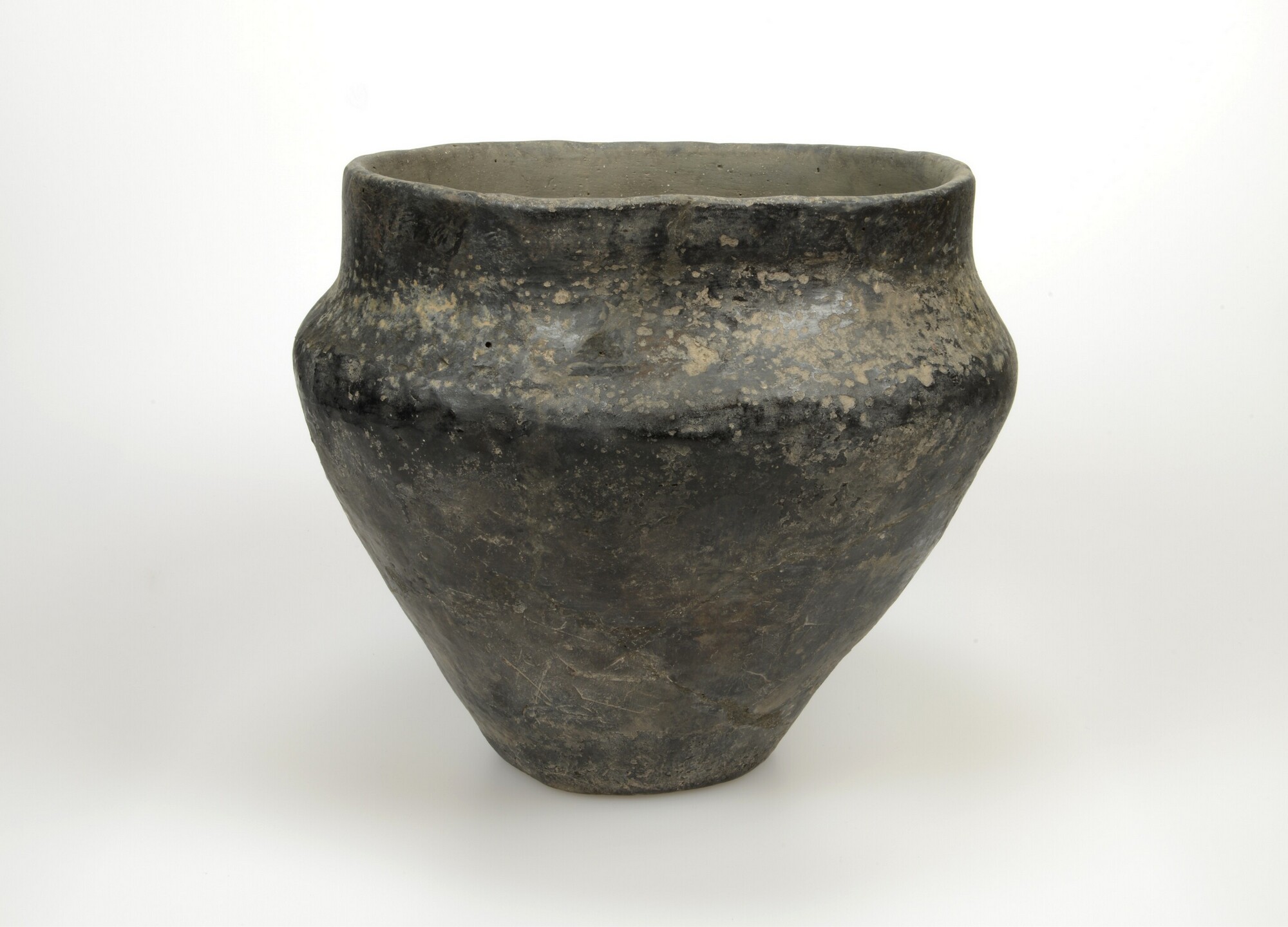 Pot; tweedelige pot met hoge schouder en vrijwel rechtopstaande, afgeplatte rand; s-vormig profiel; gepolijste/gegladde wand; standvlak; potgruis magering; vondstomstandigheden: onderzijde kuil (pot 56)