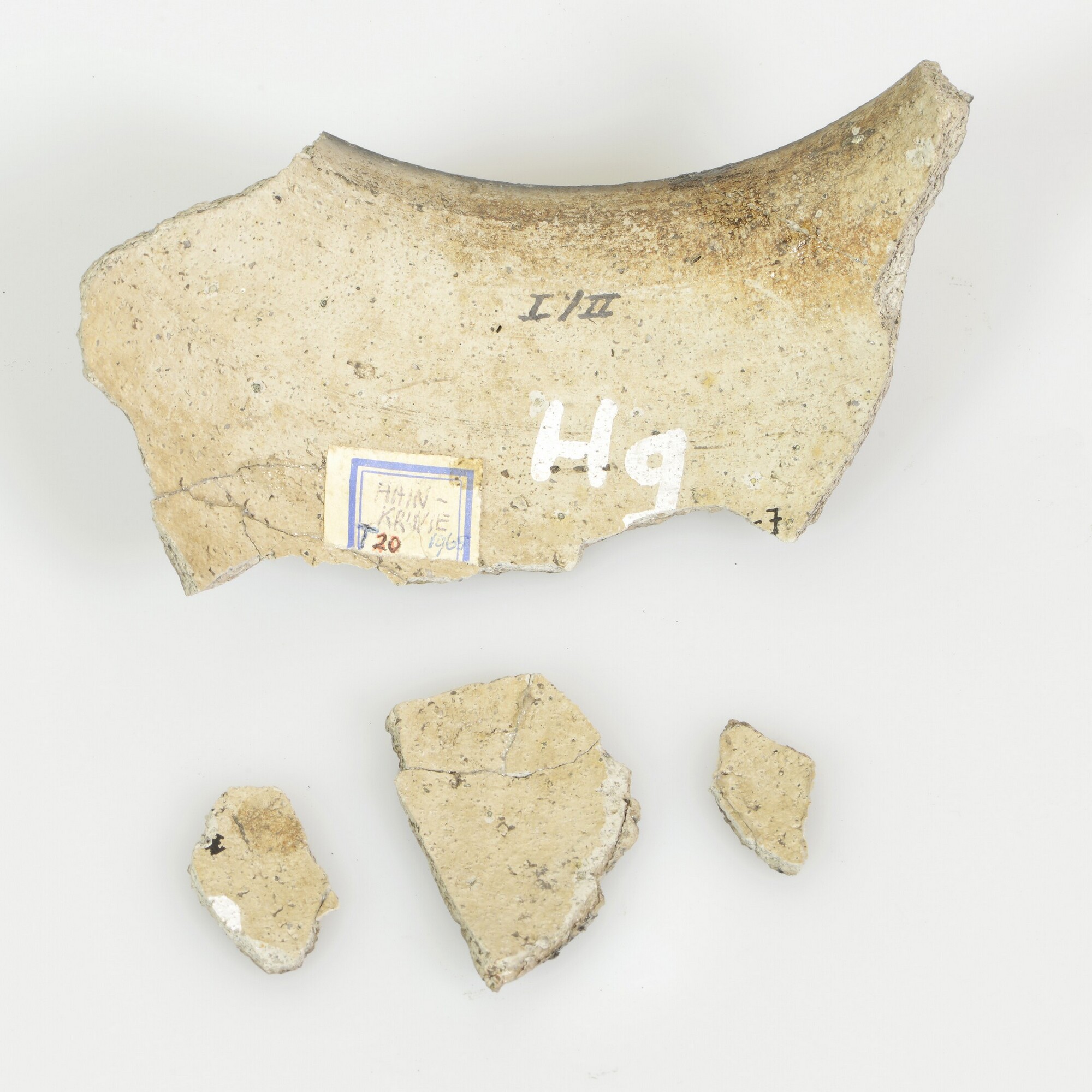 Kookpot; fragmenten; type Stuart 201a, Brunsting 1; lichtgrijs ruwwandig aardewerk; bolvormige pot met omgeslagen rand en twee horizontale groeven op de schouder onder de hals; rand en schouder beroet; vondstomstandigheden: palissade, 1965