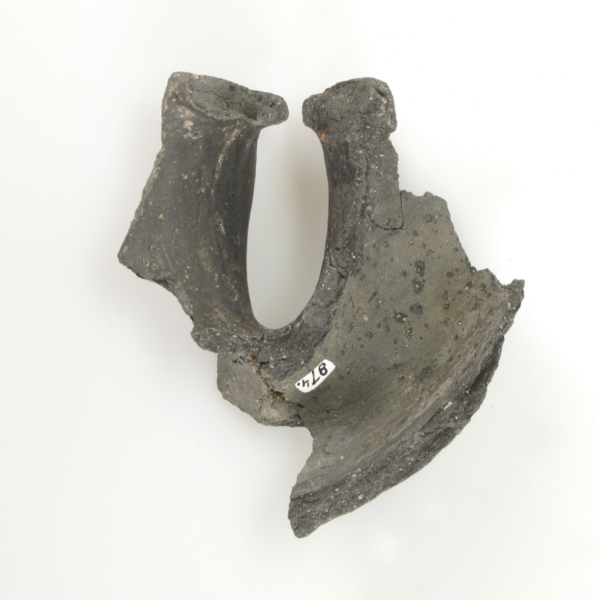 Drinkhoorn?; grijs baksel met fijn zand- en schelpmagering; handgevormd; rondlopend reservoir met twee mondopeningen aan bovenzijde; herkomst midden- Duitsland?