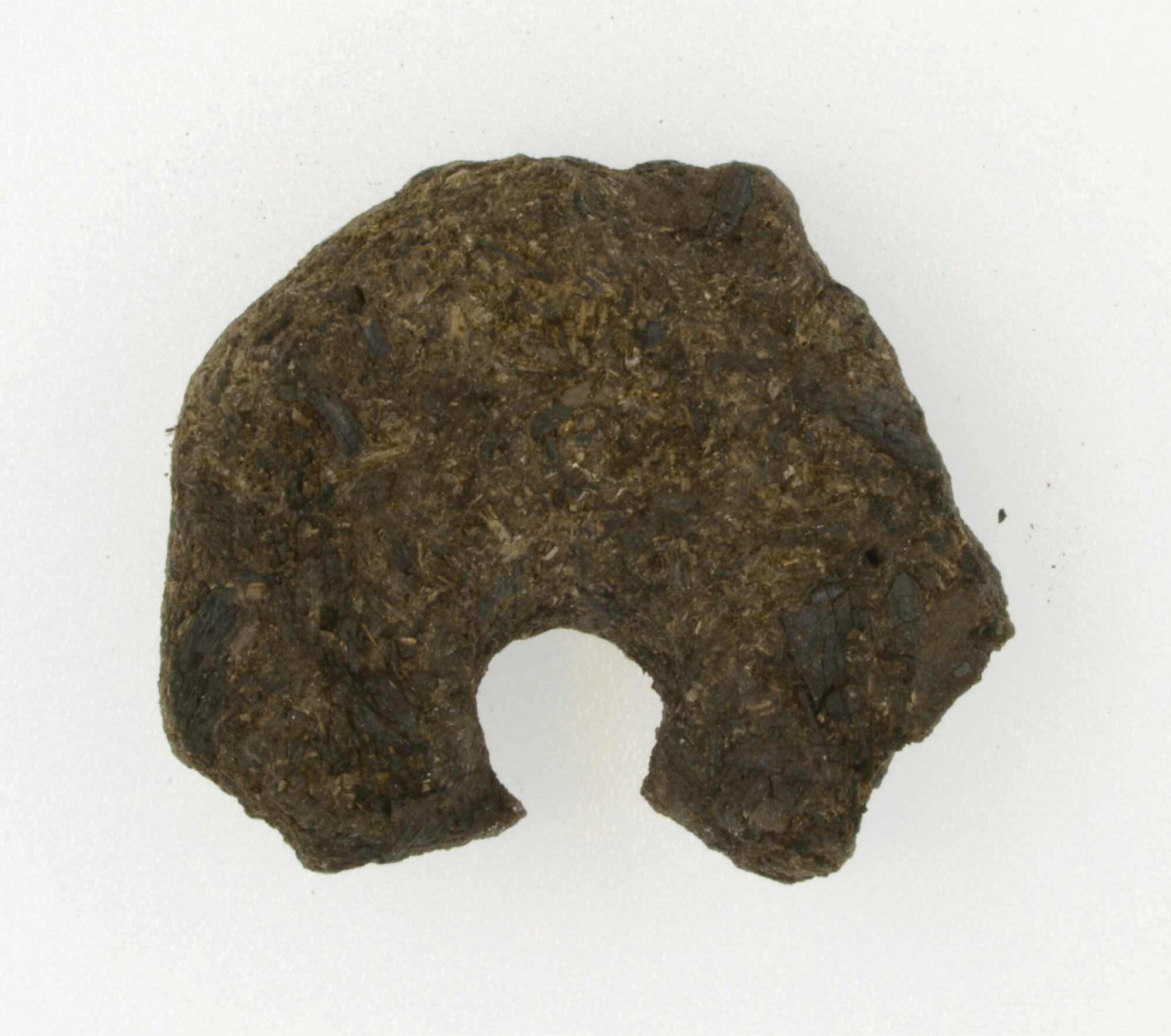 Kraal ?; verbrand stukje hout met doorboring in het midden; twee bij elkaar horende fragmenten; vak: c24:53, laag XVI, vondstdatum: 12-10-1977