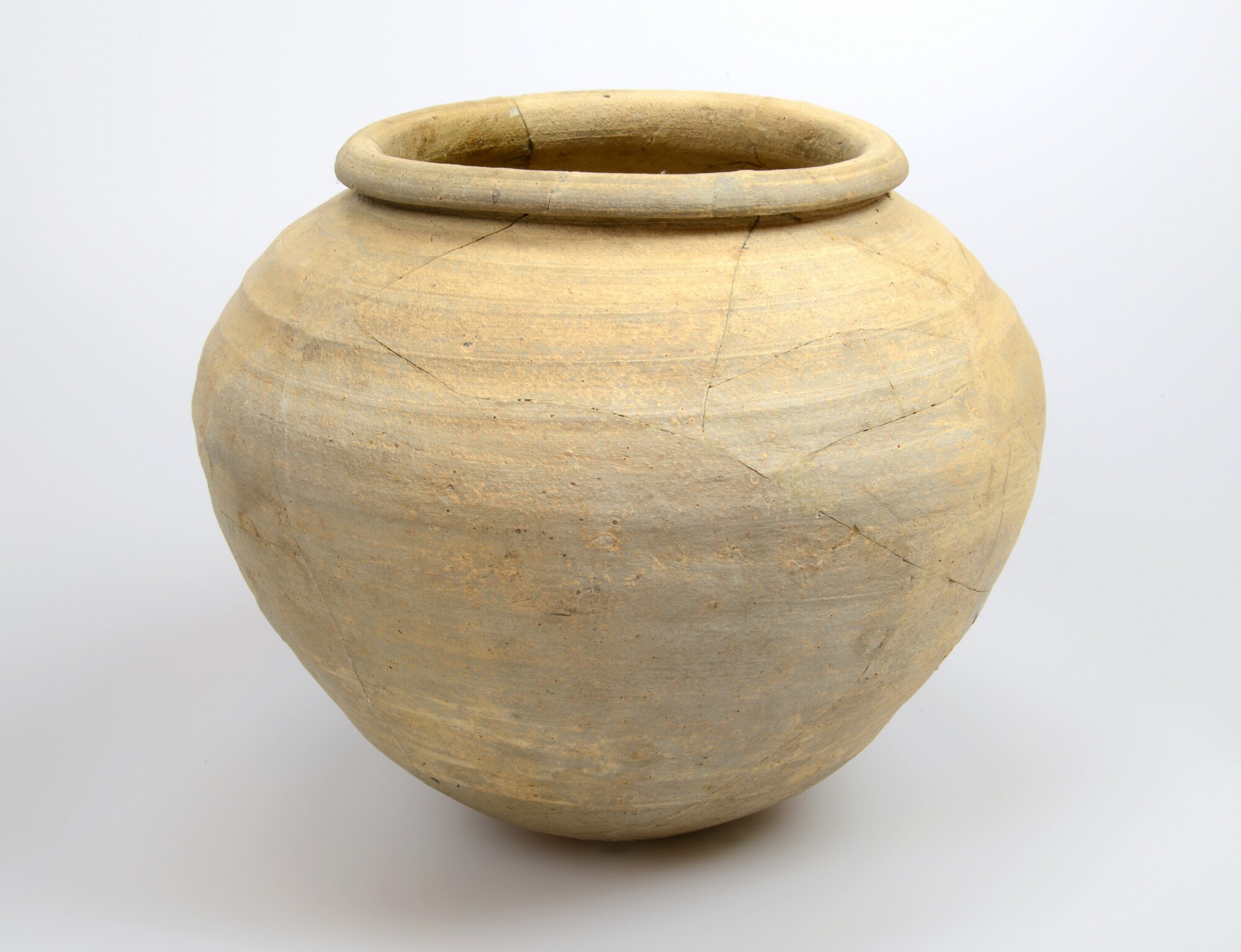 Bolpot; type W-III-A; bolvormige pot met korte, verdikte, horizontaal omgeslagen rand met draairibbels, lensvormige bodem; Karolingisch draaischijf-aardewerk; herkomst: Vorgebirge